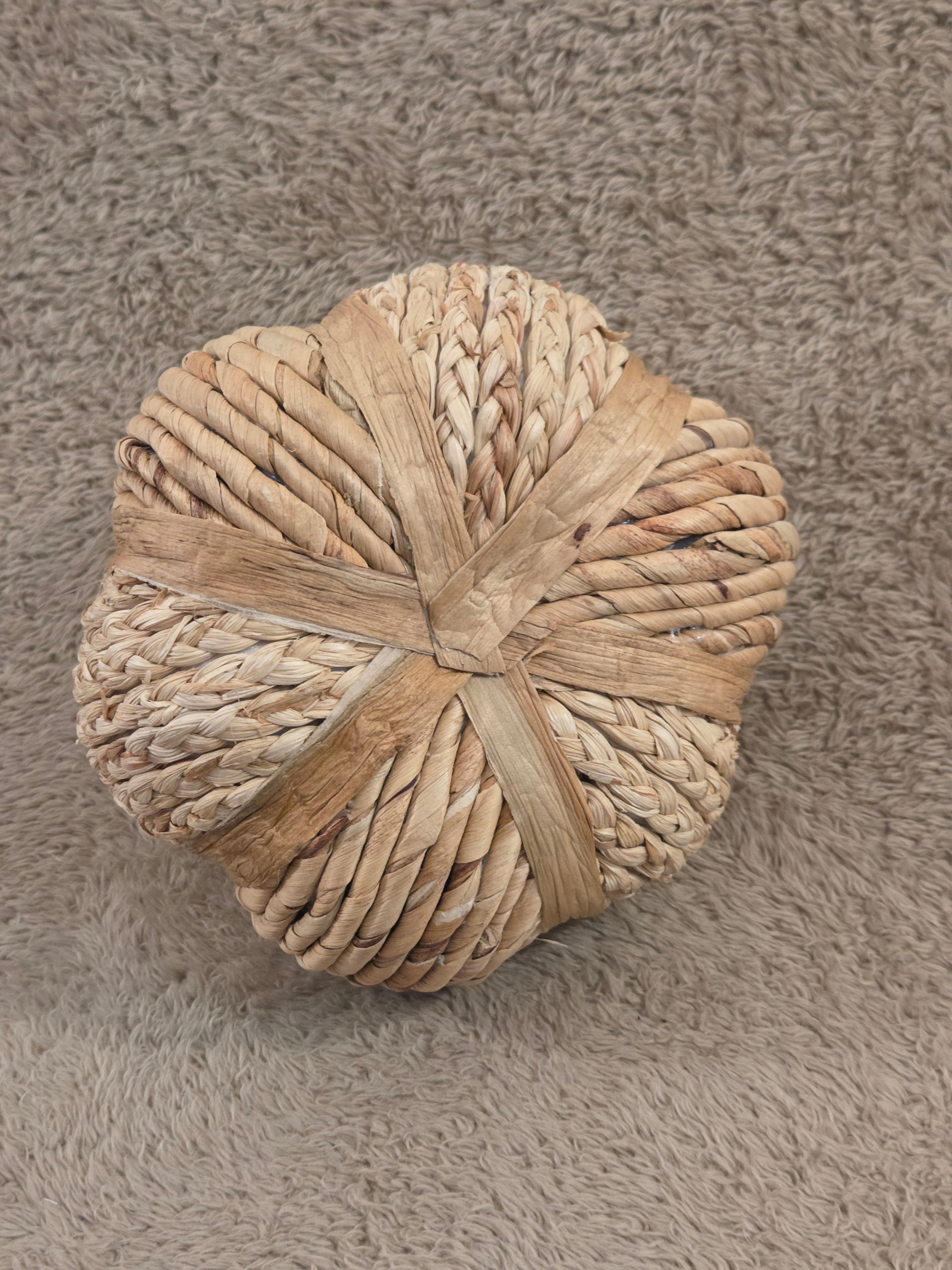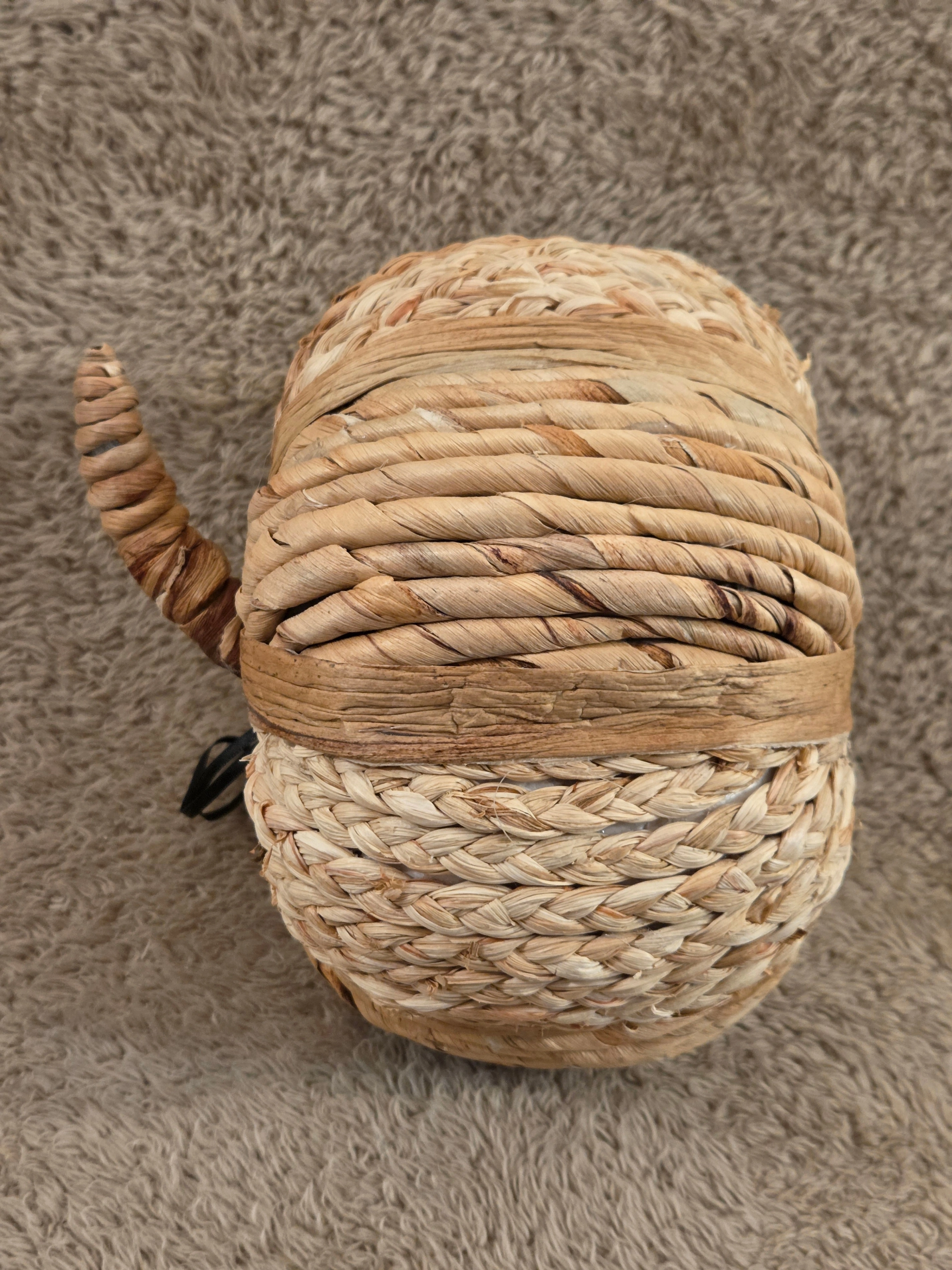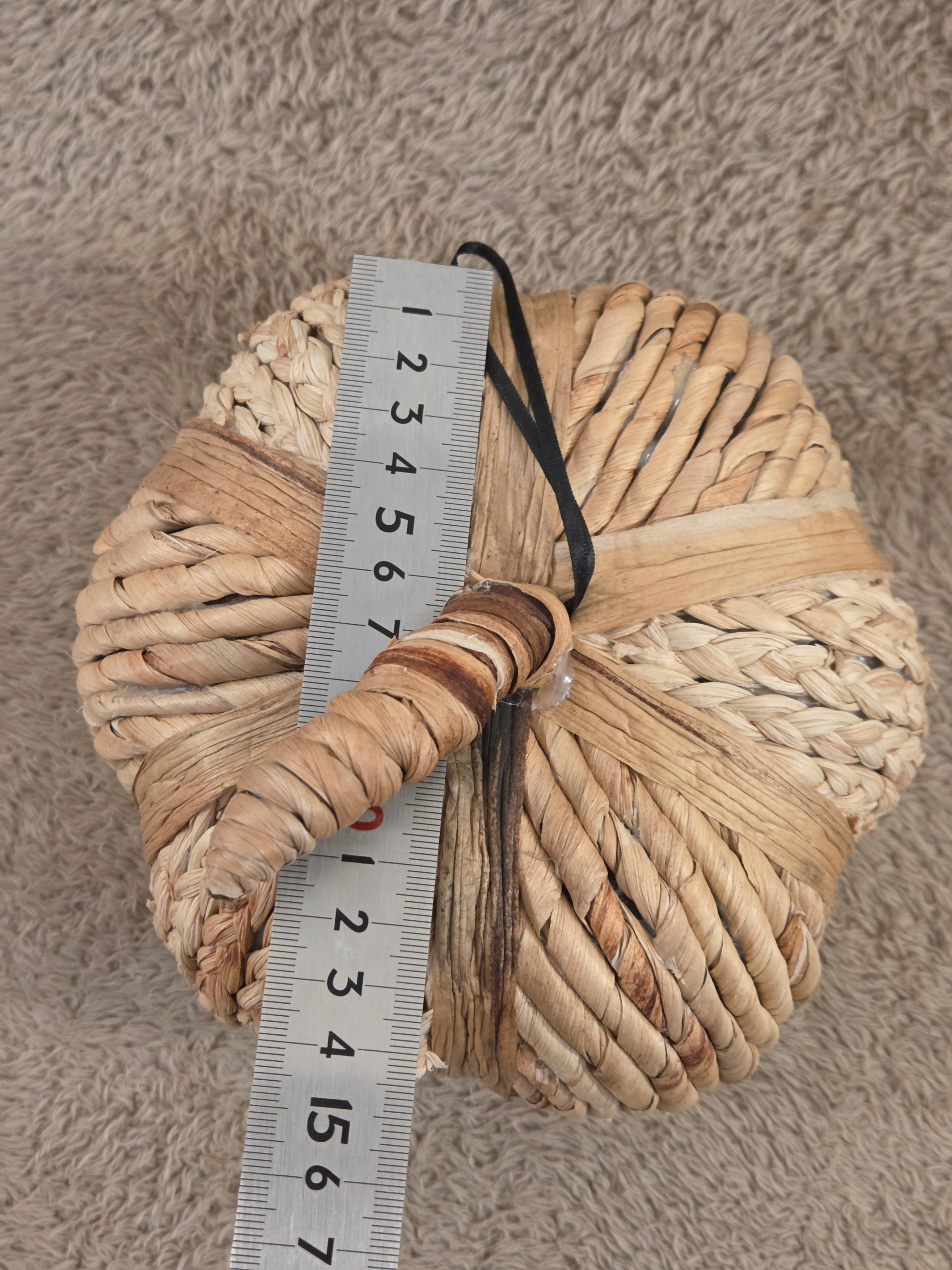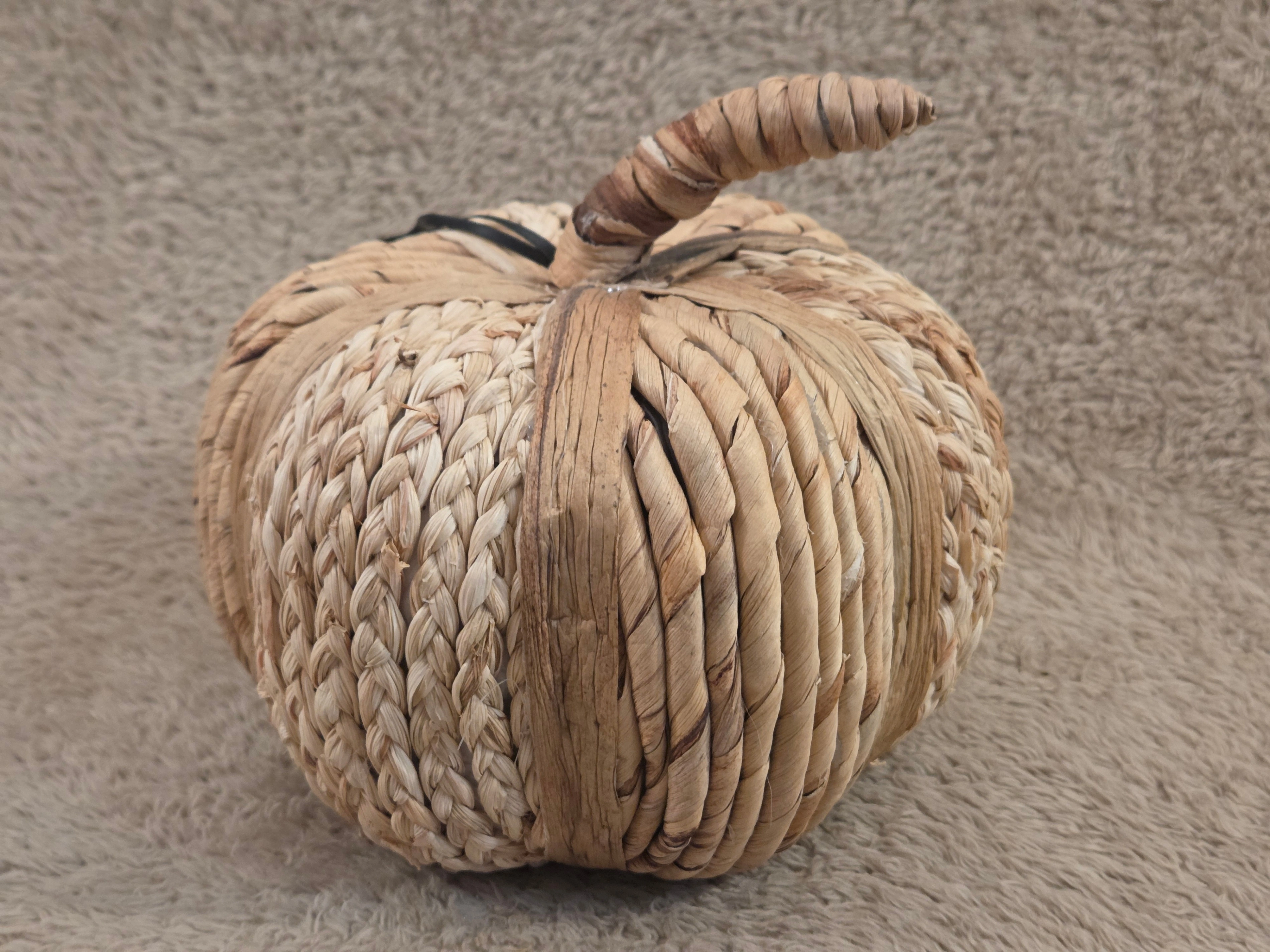 – Key specs: decorative pumpkin made of braided natural fibers (straw/seagrass style), lightweight, neutral beige tones, rustic/boho look, small size for shelf or table display