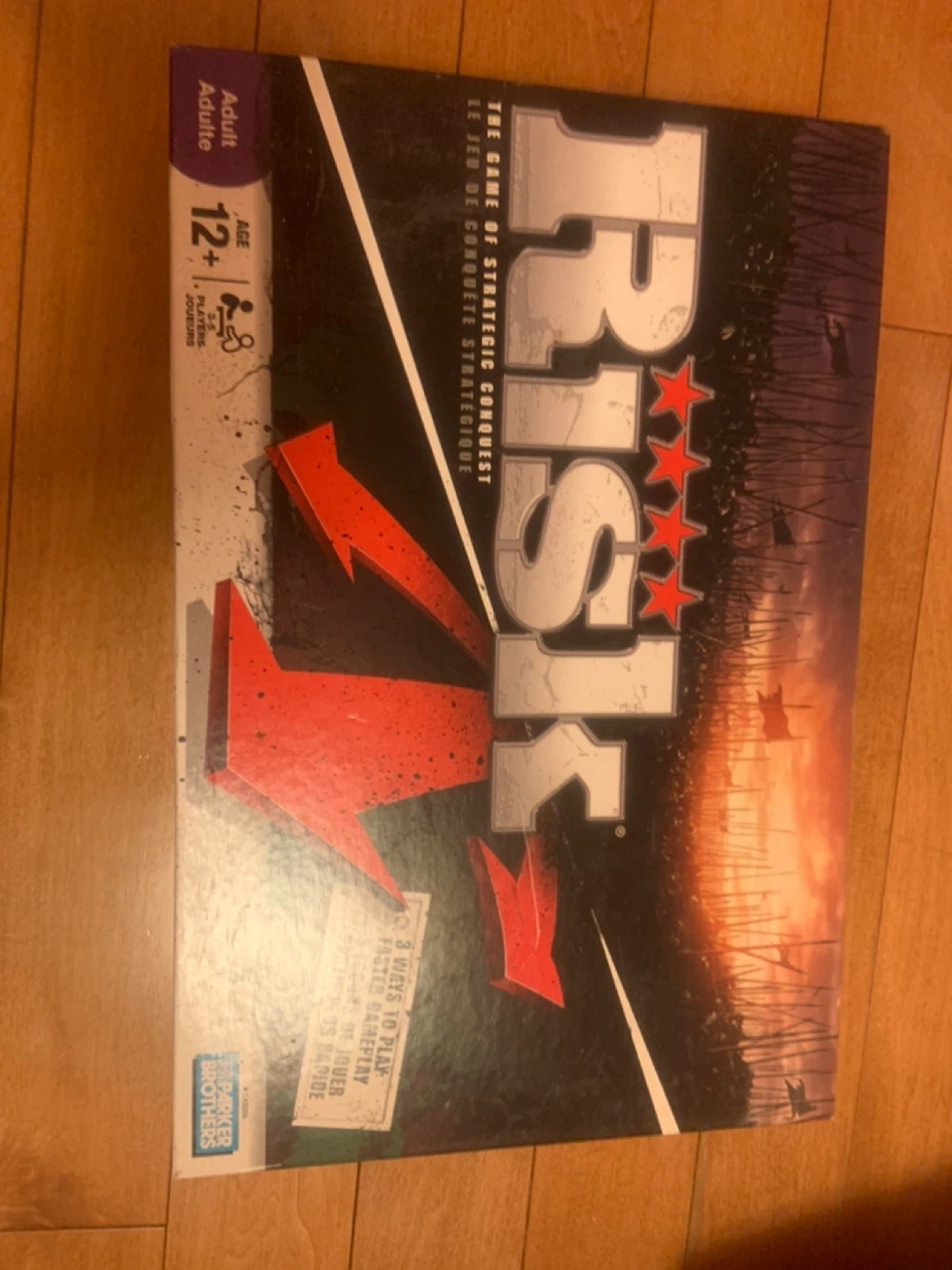 Selling the board game Risk, also known as The Game of Strategic Conquest! It's for adults and includes 3 ways to play for a faster gameplay experience. Great for 3-5 players