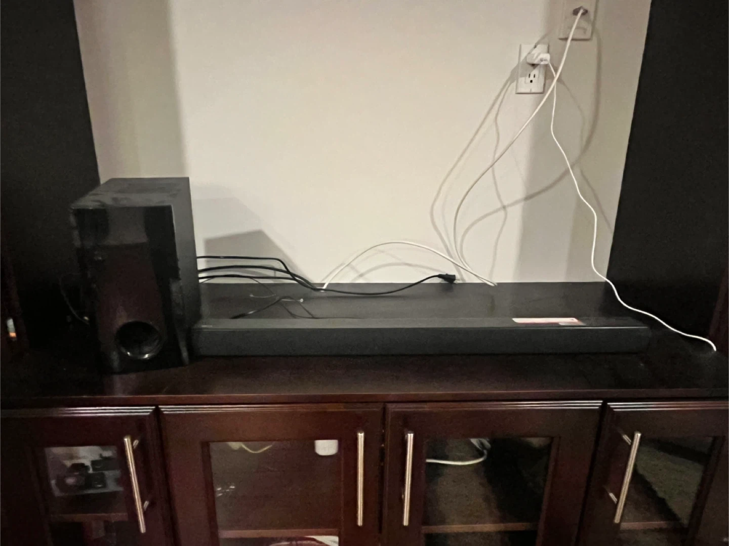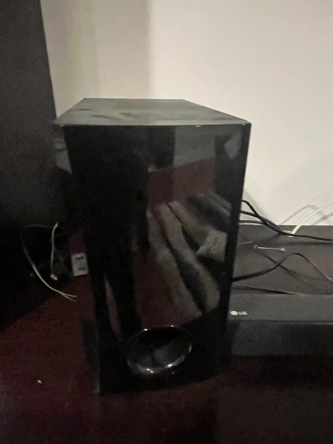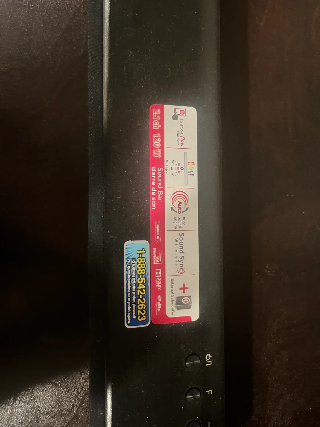 Selling an LG sound bar with a subwoofer. It's a 2.1 channel system with 120W total power. Features include Bluetooth connectivity and Sound Sync.