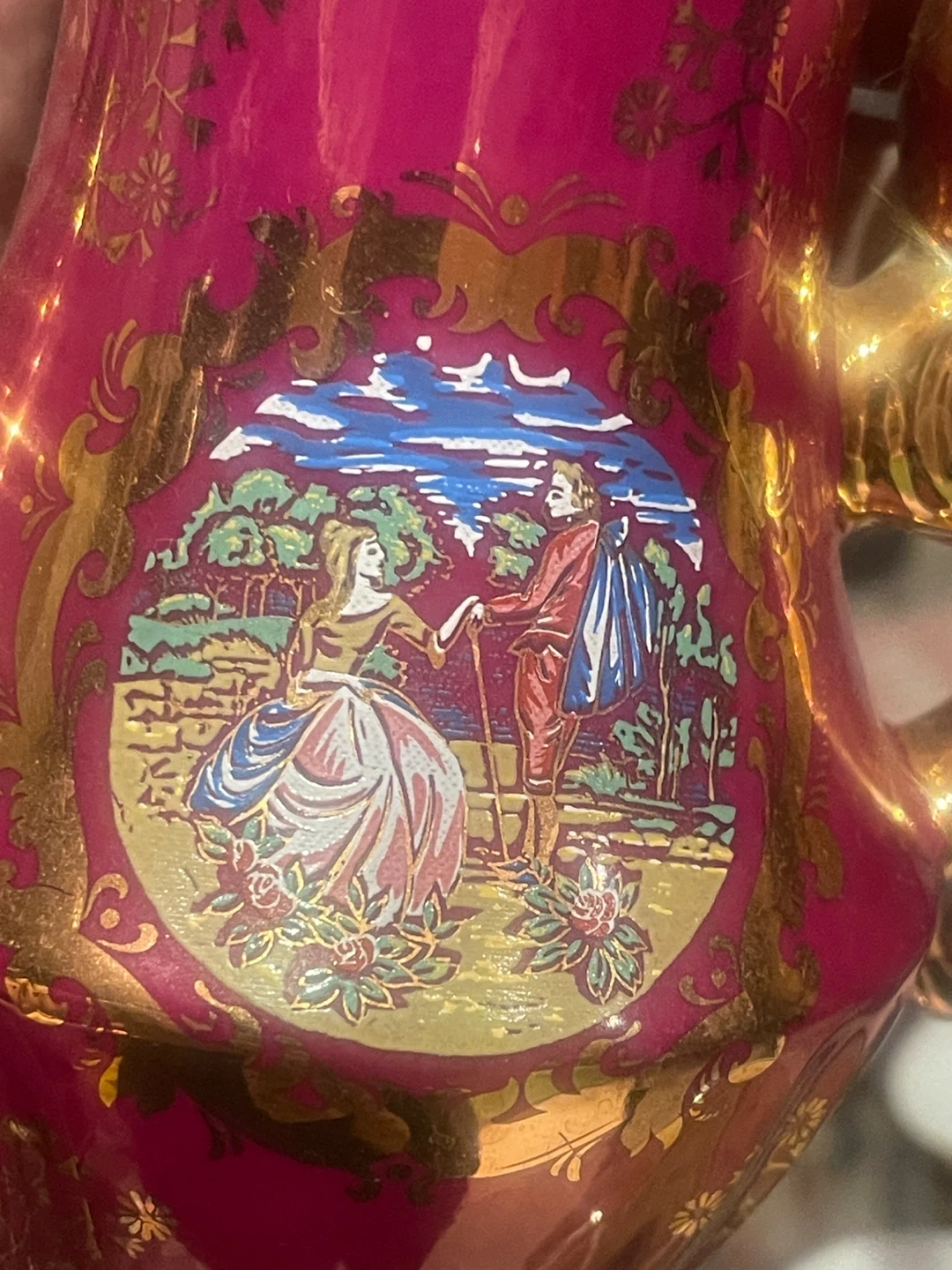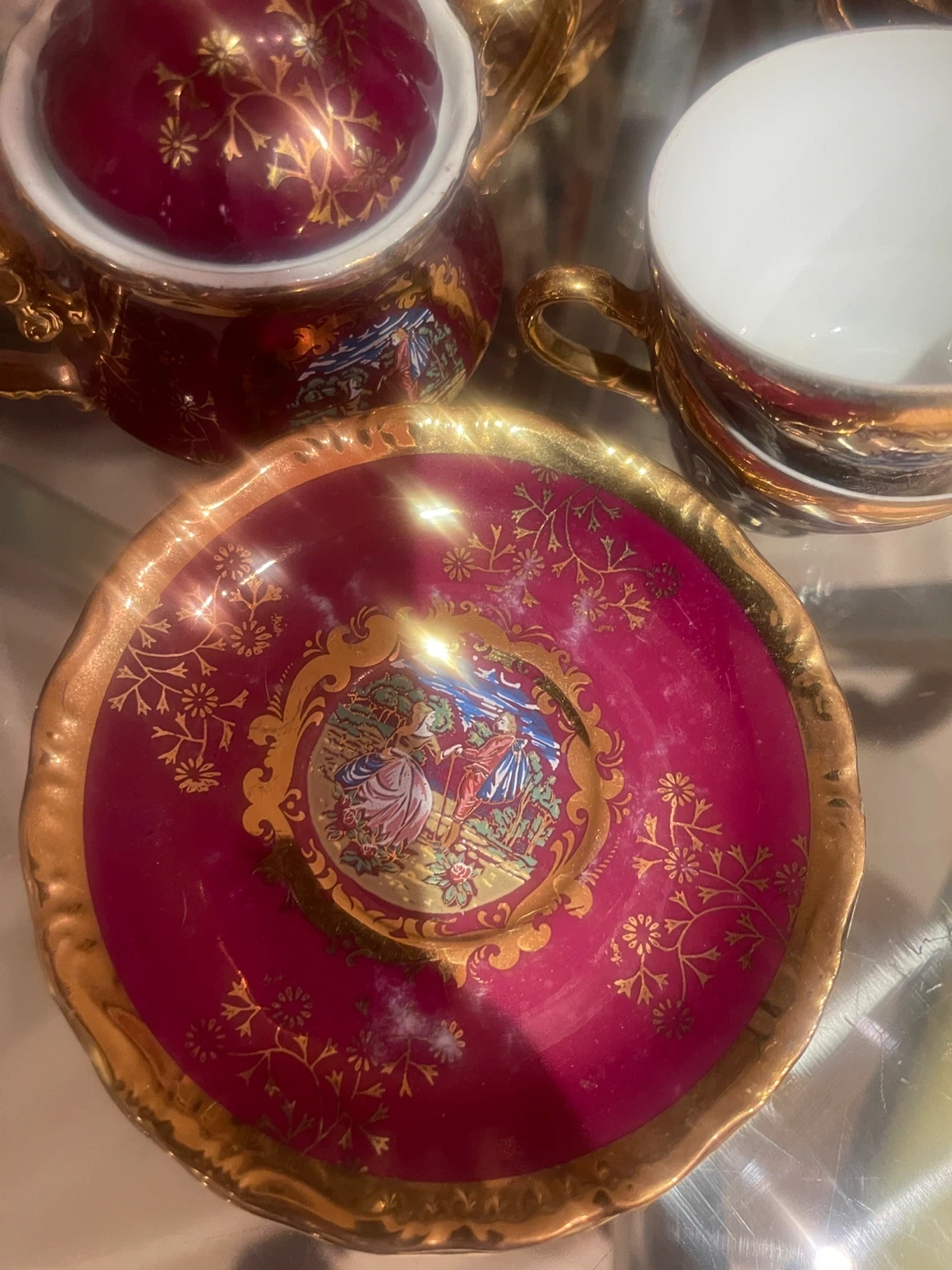 Beautiful vintage porcelain tea set made in Japan, featuring a rich ruby red glaze with ornate gold detailing and romantic pastoral scenes. A classic, elegant set that displays beautifully and adds old-world charm to any collection.