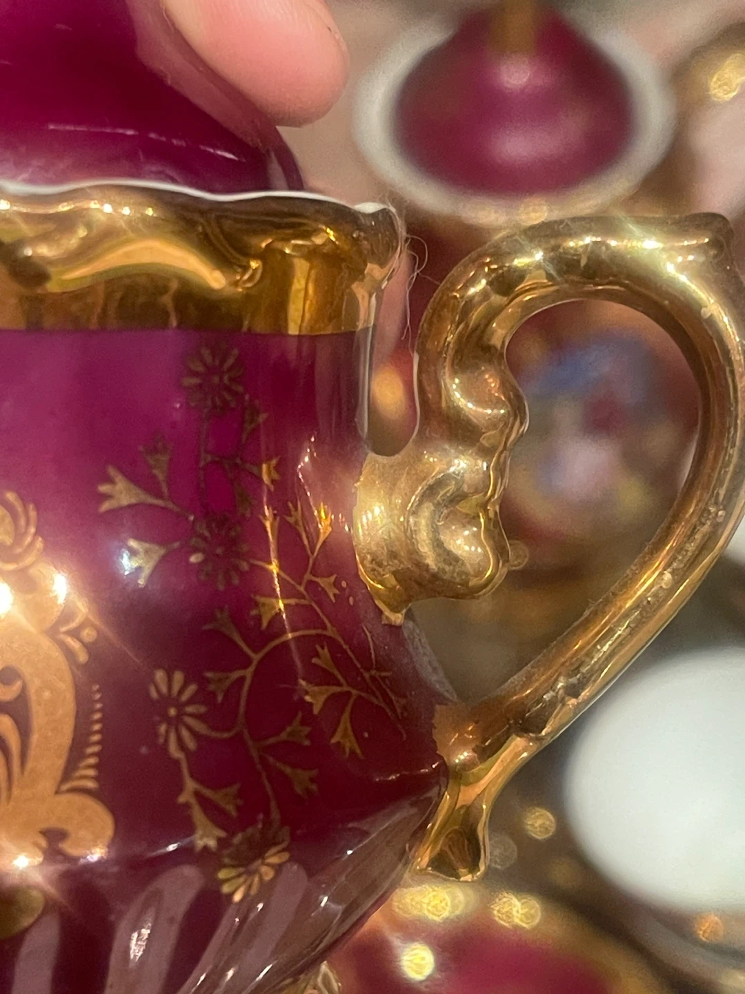 • Deep ruby/burgundy color with gold gilt accents