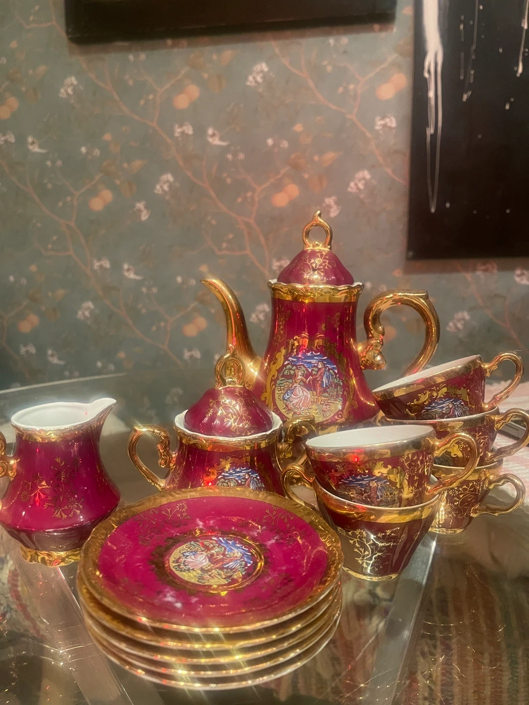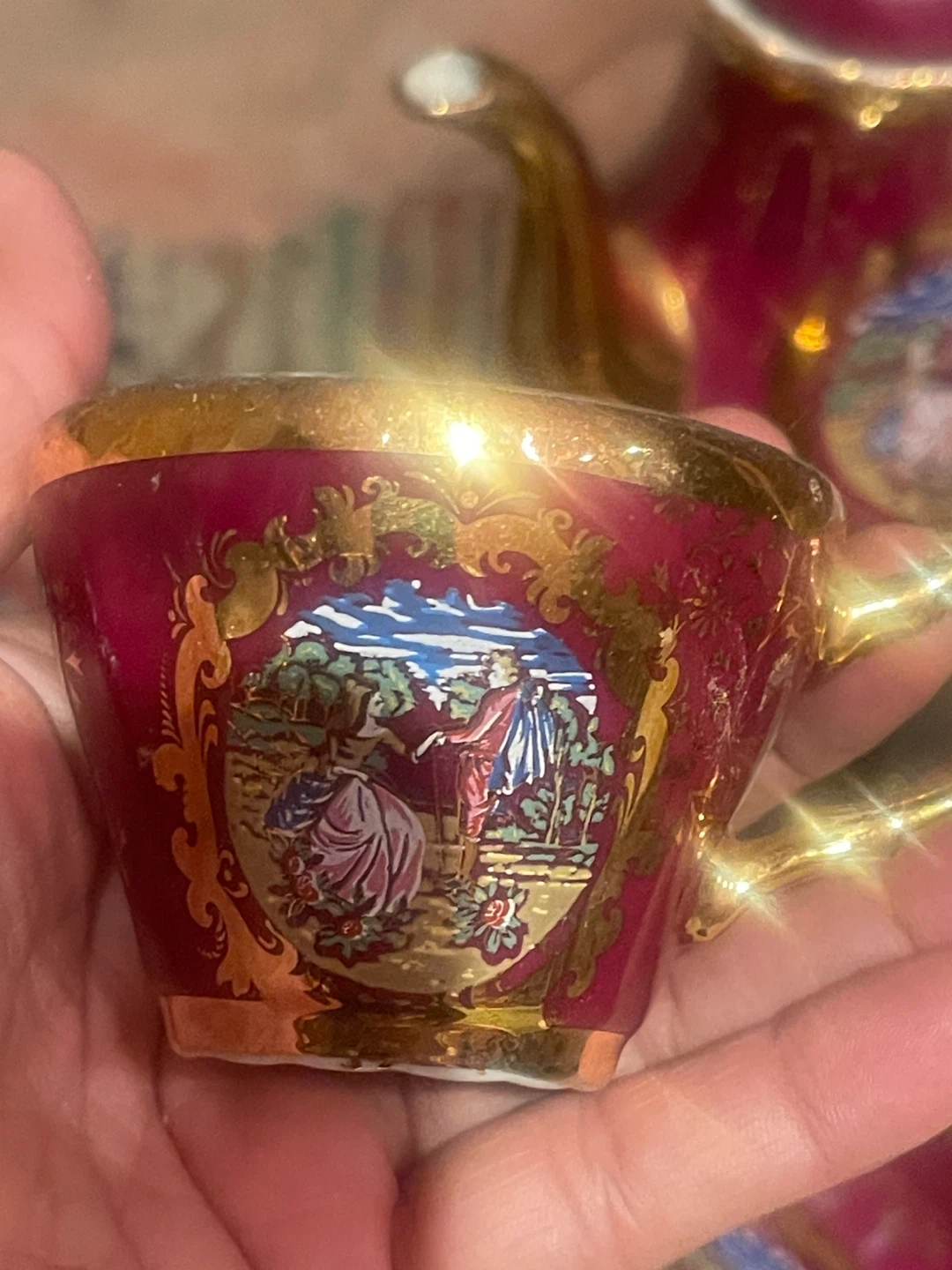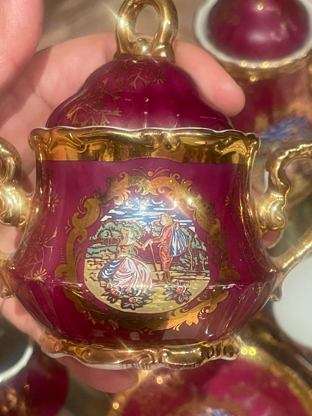 Beautiful vintage porcelain tea set made in Japan, featuring a rich ruby red glaze with ornate gold detailing and romantic pastoral scenes. A classic, elegant set that displays beautifully and adds old-world charm to any collection.