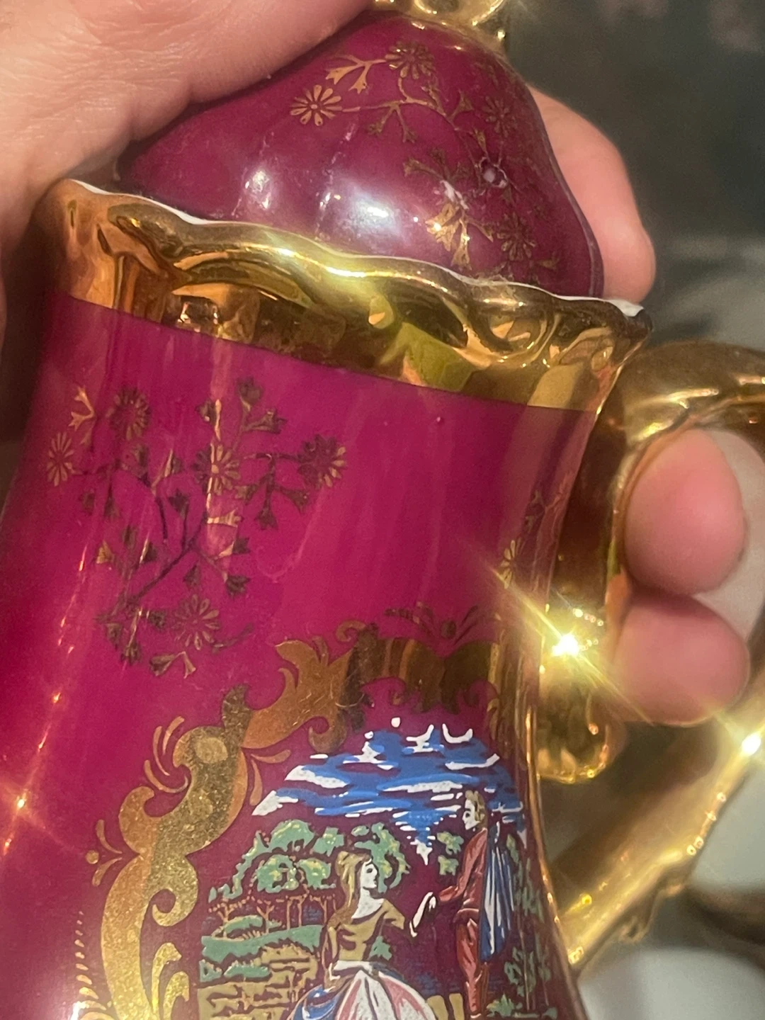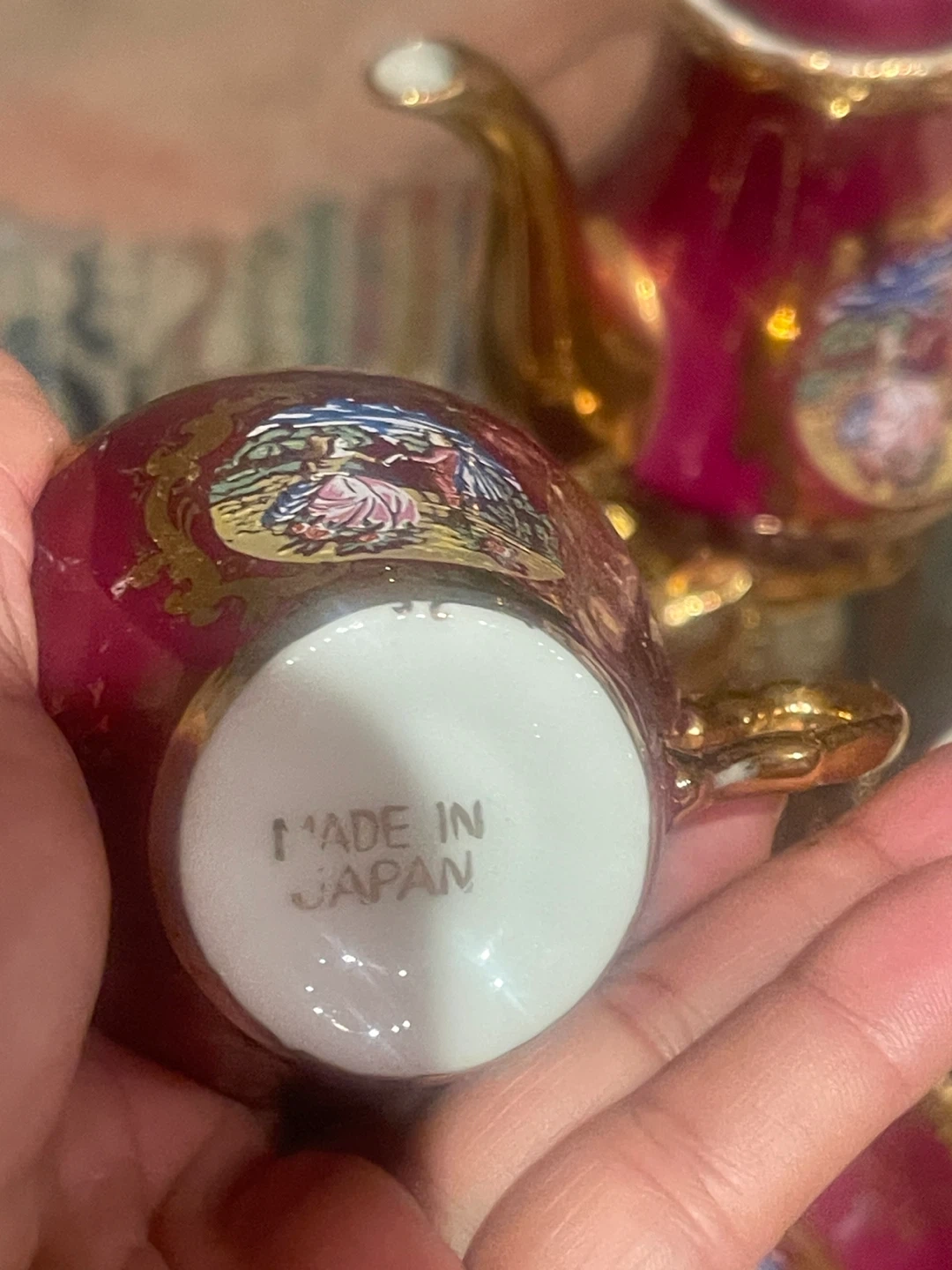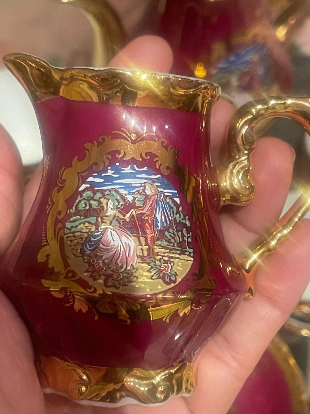 Beautiful vintage porcelain tea set made in Japan, featuring a rich ruby red glaze with ornate gold detailing and romantic pastoral scenes. A classic, elegant set that displays beautifully and adds old-world charm to any collection.