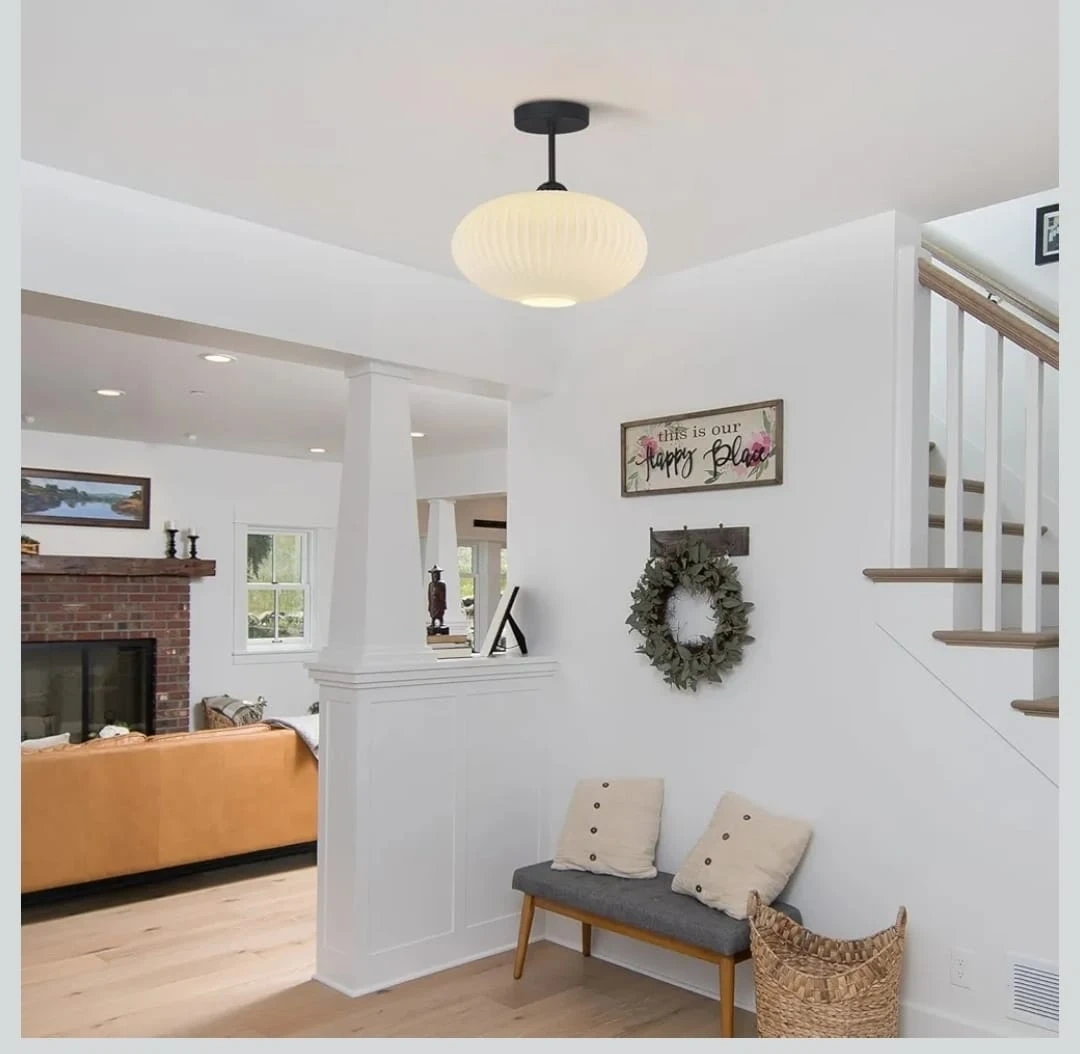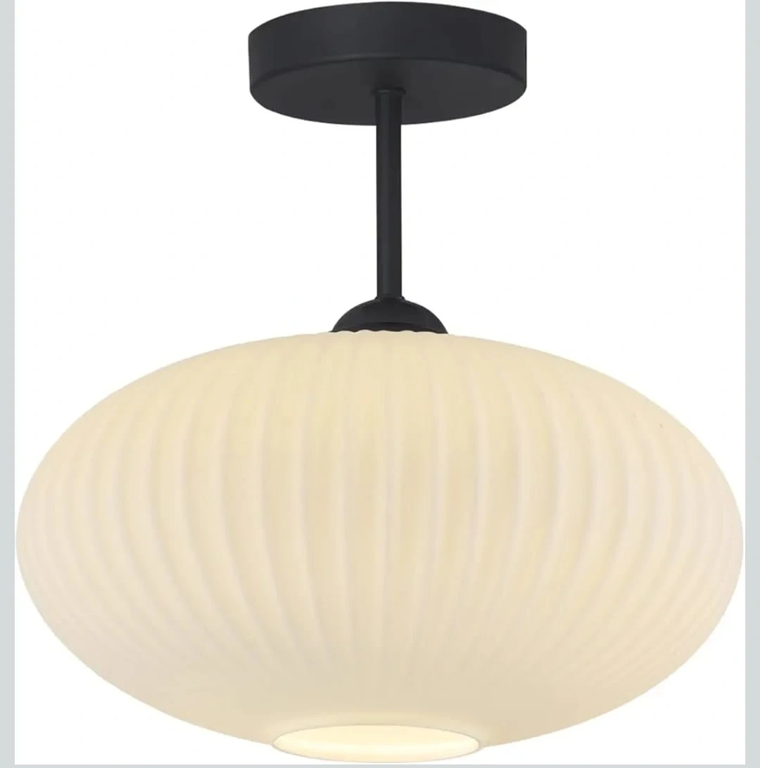 Selling a ceiling light with a ribbed glass shade! It has a matte black canopy and the dimensions are approximately 25cm/9.8" wide and 17cm/6.7" high. The canopy is 12cm/4.7". Comes with the original box