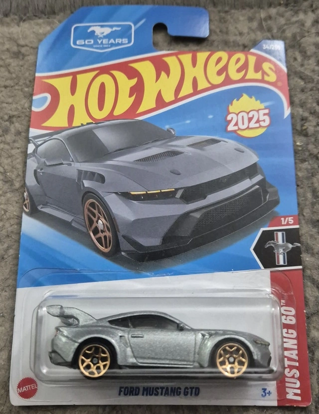 Ford Mustang GTD Collection: 2025 Hot Wheels Mainline Series: Mustang 60th Colour: Grey Description: Detailed headlights and taillights I also have the 2026 HW version in Holographic Blue with a red stripe on the hood (black) and roof Asking for $5 or best offer. I am looking only to sell one to keep the other. However, I am willing to get them go as a pair for $11 If the ad is still up, it is available. Check out my other ads