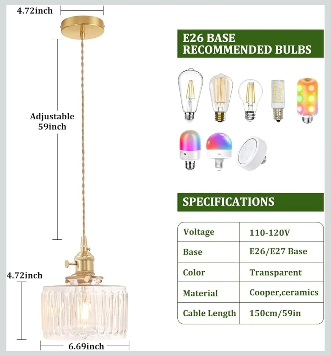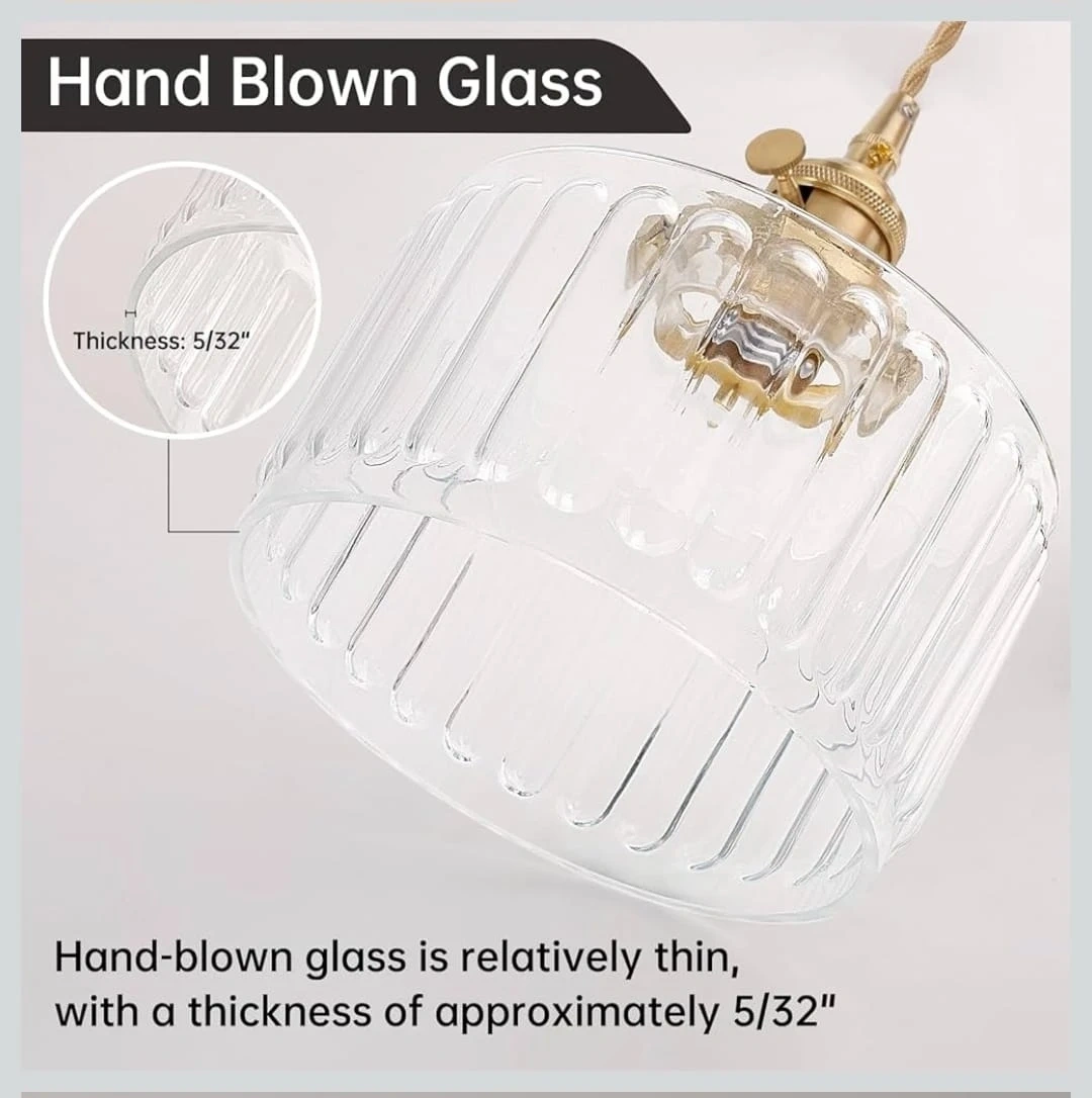 Add a touch of elegance to your home with this transparent glass pendant light! The base is E26/E27 and the cable length is 150cm/59in. It's made of cooper and ceramics, and the hand-blown glass is relatively thin with a thickness of approximately 5/32".