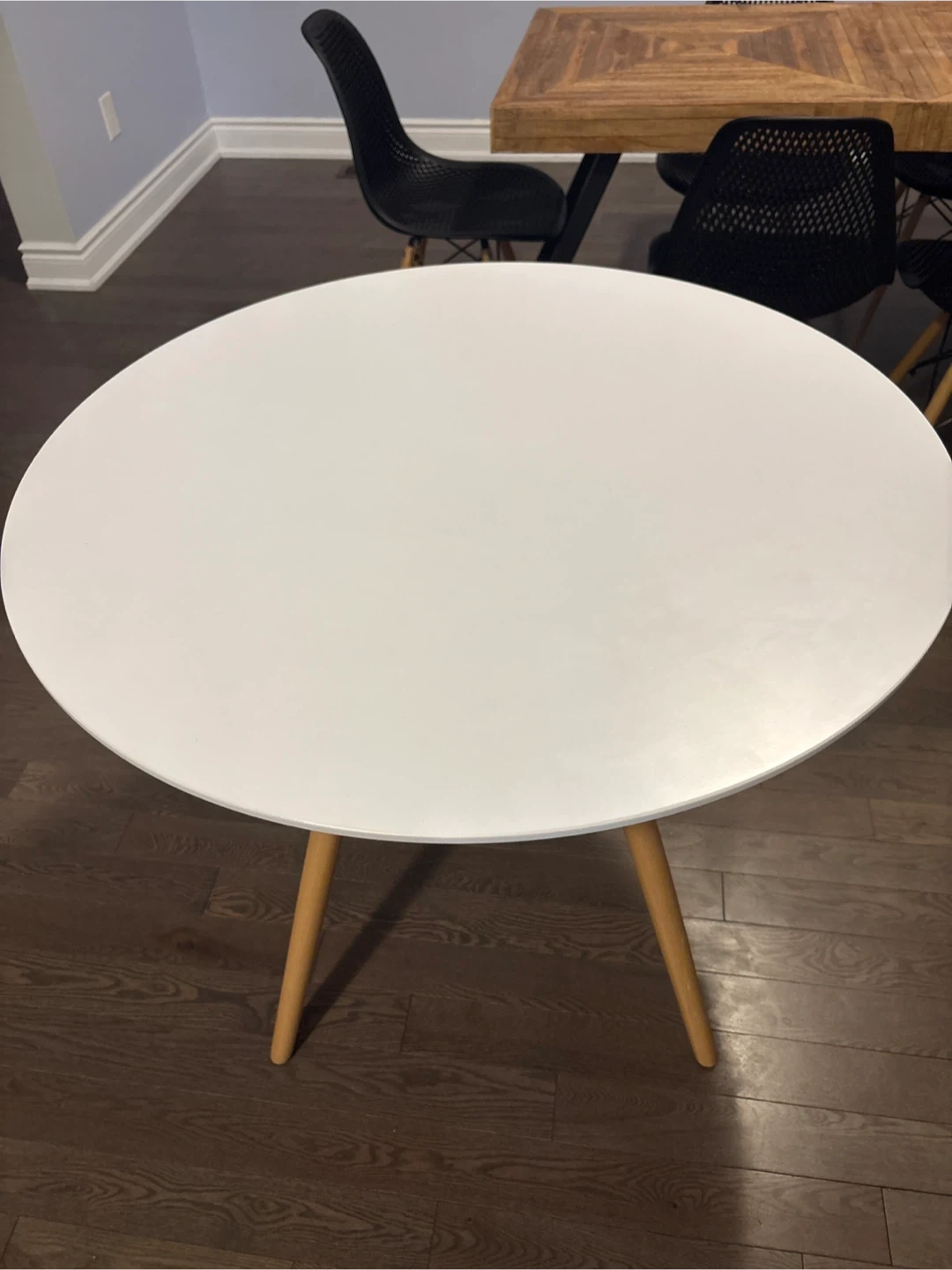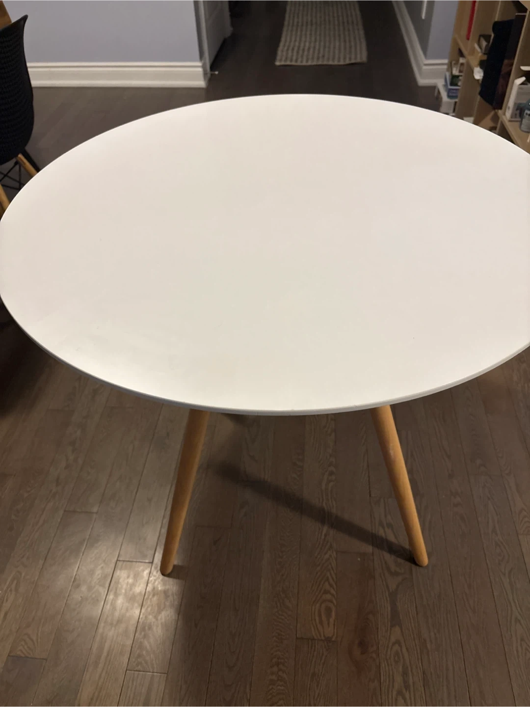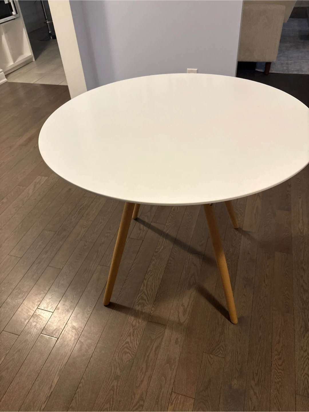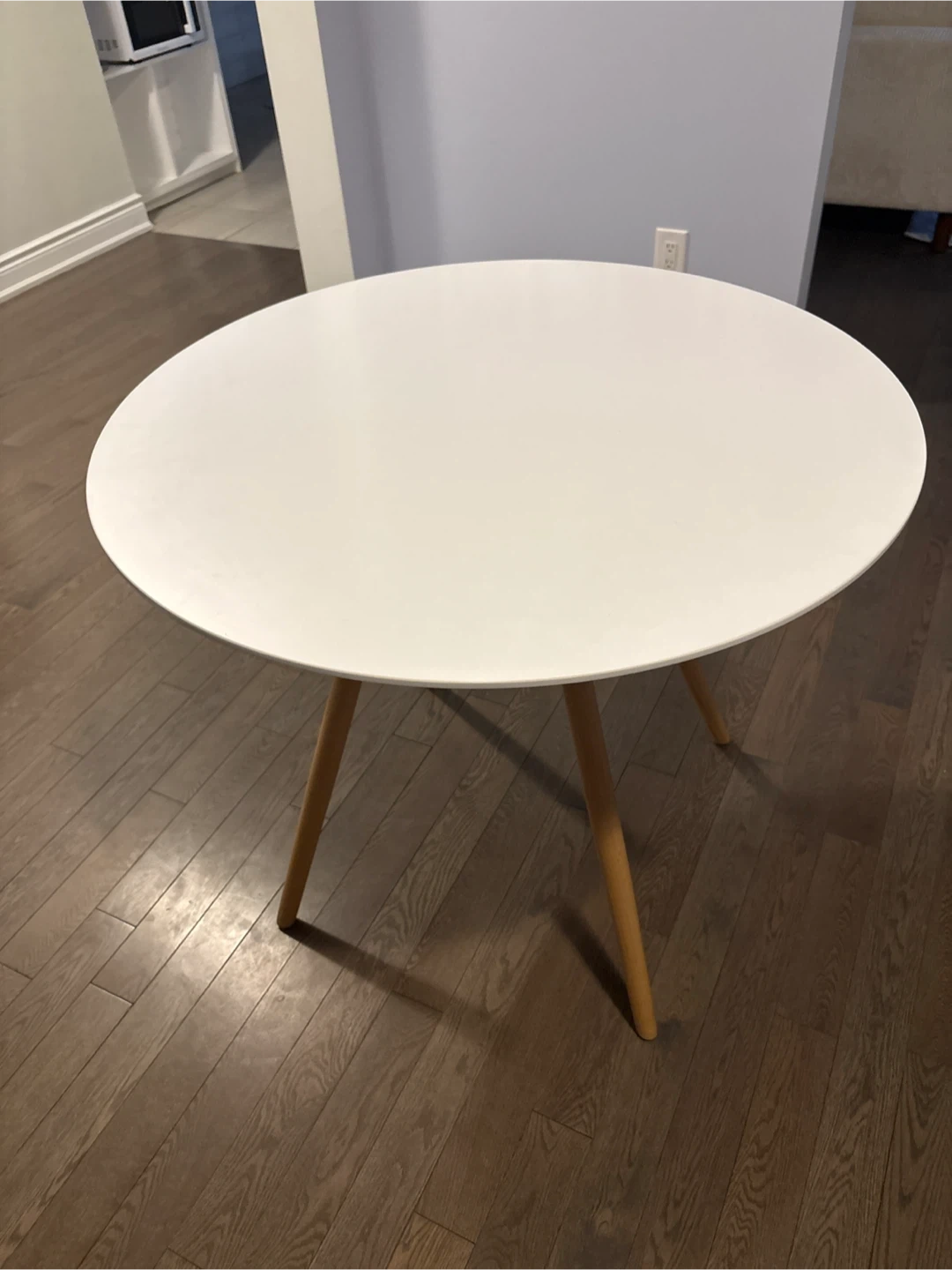 Selling a round dining table with a white top and light wood legs. It's in great condition and would be perfect for a small space or apartment. The table is sturdy and stylish, ready to brighten up your dining area!
