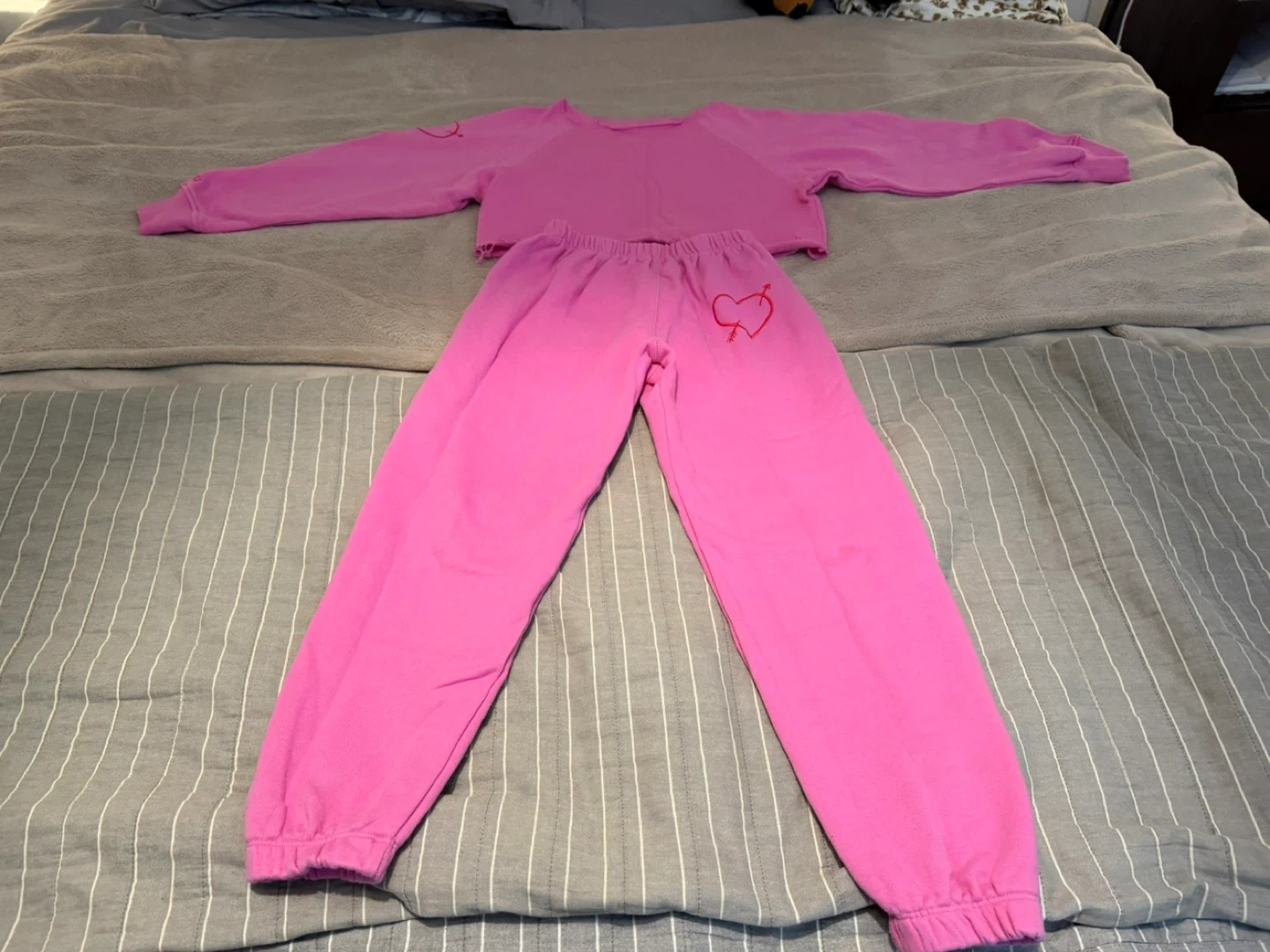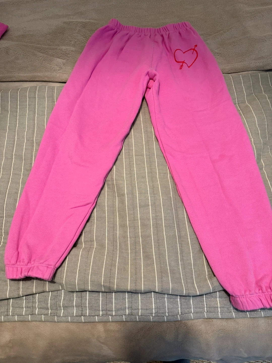 Selling a pair of Katie J NYC sweatpants in a vibrant pink color! They are a size medium and made of 100% cotton. These comfy sweatpants feature a cute heart and arrow design. Perfect for lounging or casual wear!