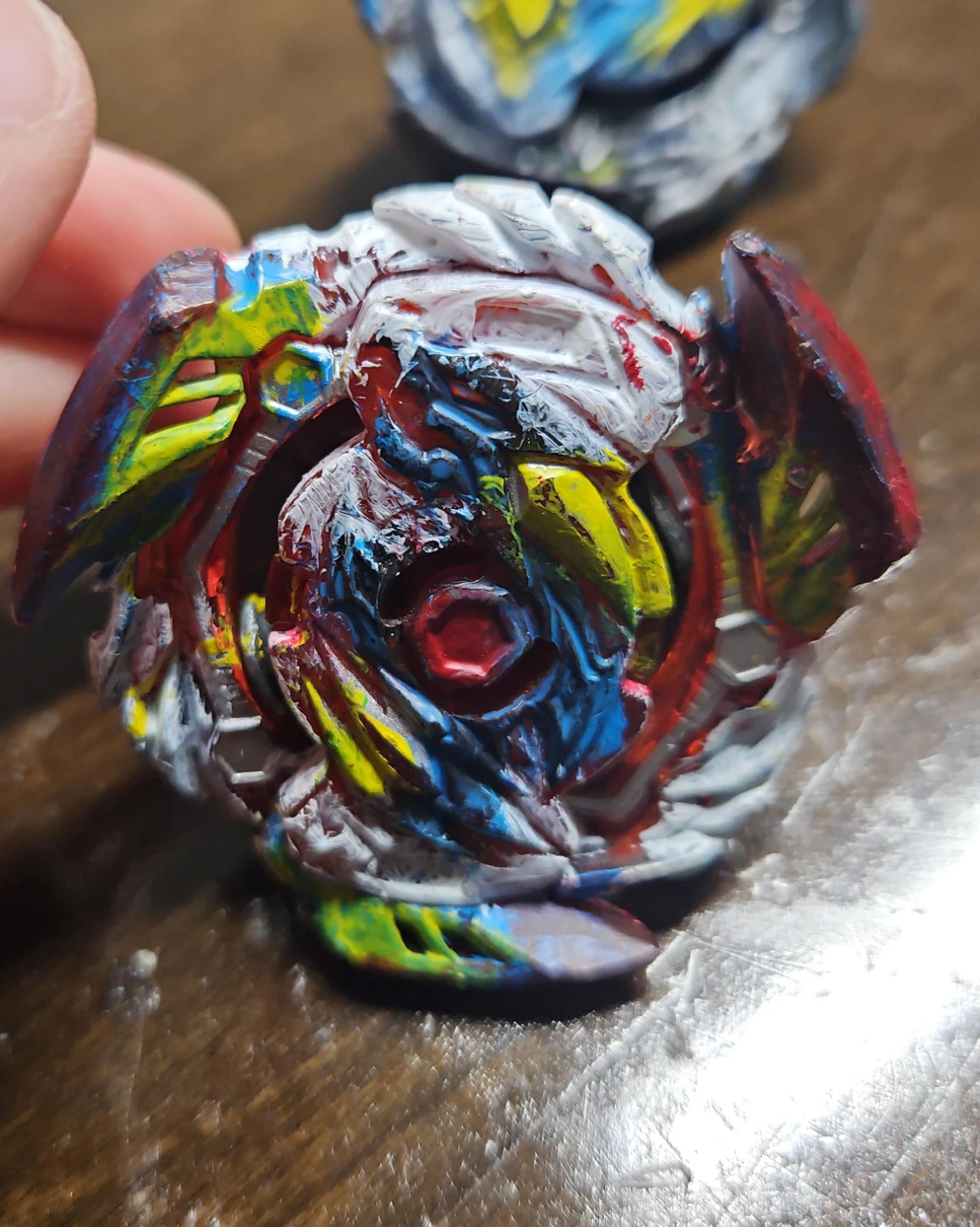 Selling a custom painted Beyblade. It's got a unique design with red, white, blue, and yellow colours. It's in good condition and ready for a new battle!