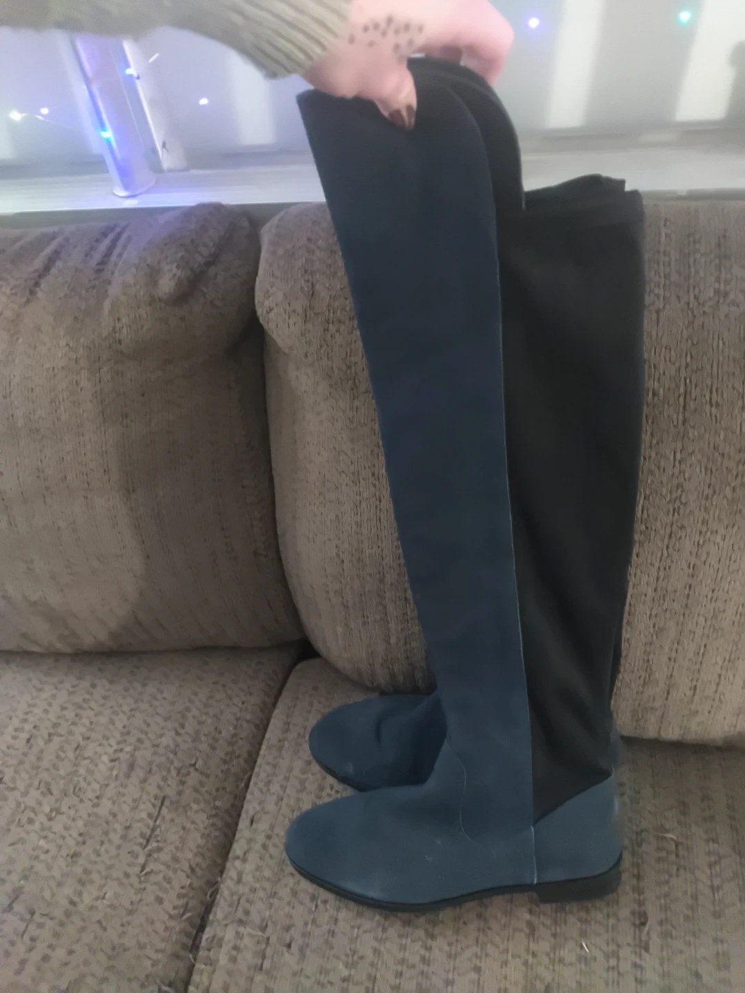 Selling a pair of over-the-knee boots in a two-tone design, featuring a mix of blue and black. They're in good condition and ready for a new owner