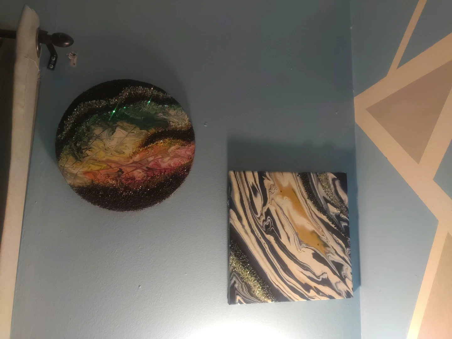 Selling two unique pieces of handmade abstract art! One is a round canvas with colourful, textured details, and the other is a square canvas featuring a striking marble-like pattern. They'd be a great addition to any room!