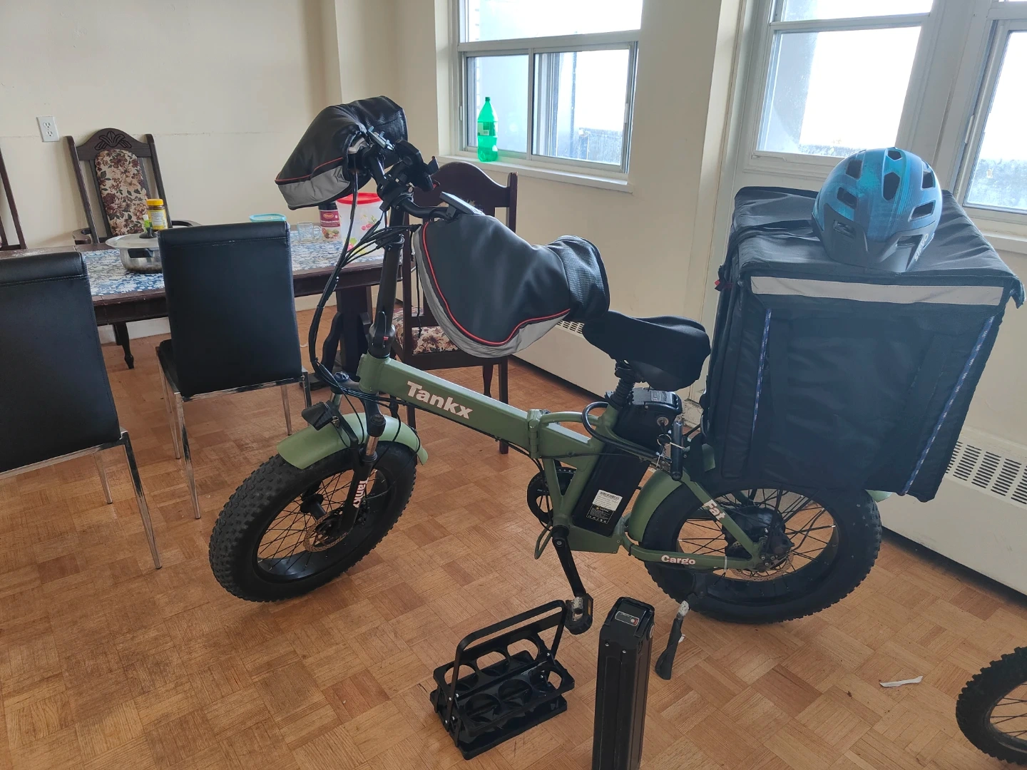Selling a Tankx cargo ebike in great condition! This folding fat tire bike is perfect for getting around town. It comes with a cargo carrier and battery. Dual battery delivery bag charger also available urgent sale contact me +1 437-235-3730