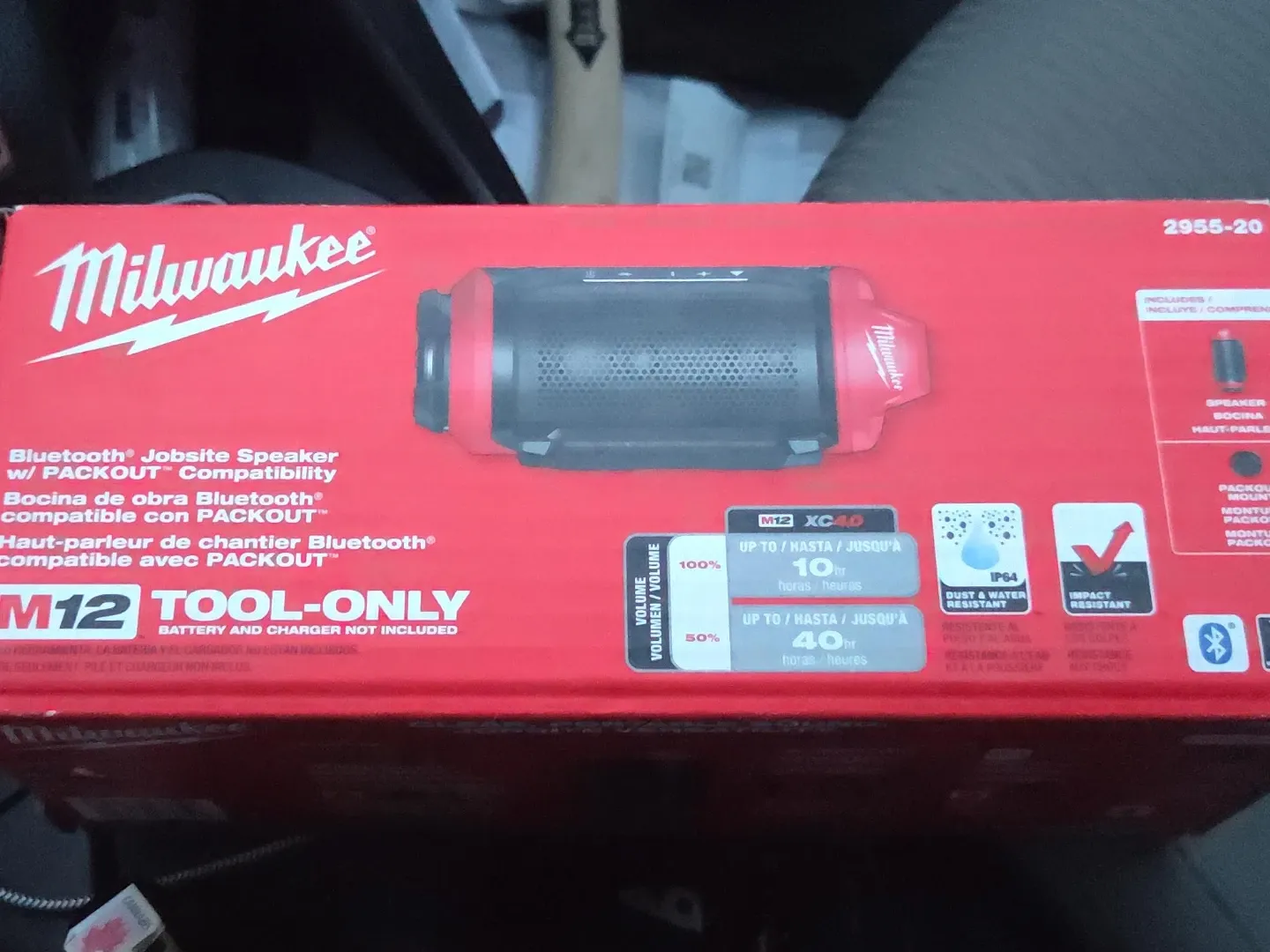 Selling a Milwaukee M12 Bluetooth Jobsite Speaker with PACKOUT compatibility. This speaker is dust and water resistant (IP64) and impact resistant, perfect for any jobsite. It can run up to 10 hours at 100% volume, or up to 40 hours at 50% volume on an M12 XC4.0 battery. Battery and charger are not included.