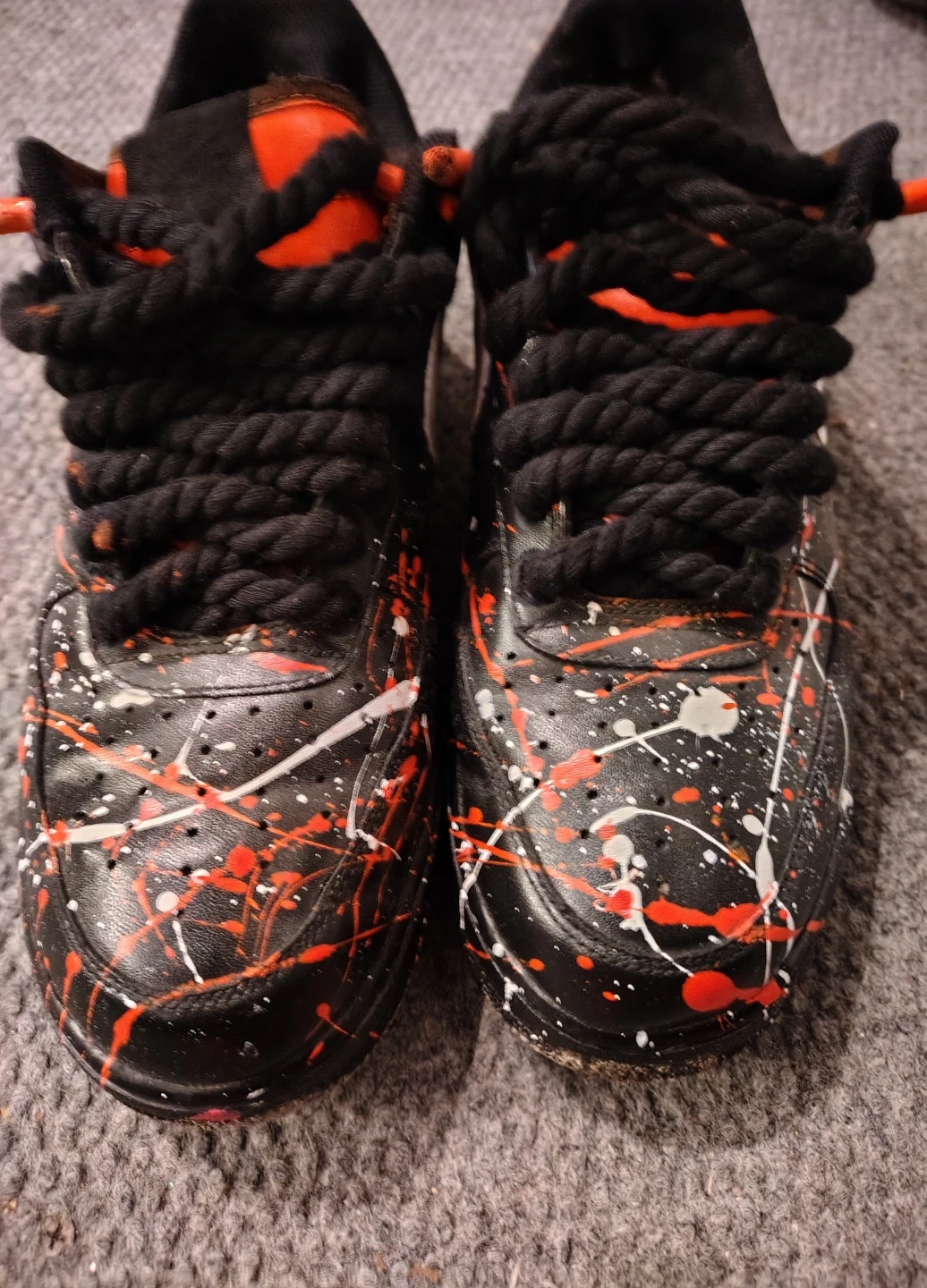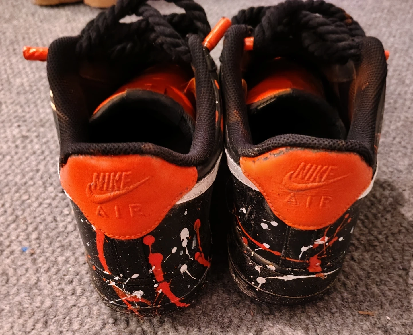 Selling a pair of custom Nike Air Force 1 shoes. They feature a unique splatter paint design in red and white on a black base. The Nike swoosh is visible on the side. Please take a close look at the photos to see the custom details!