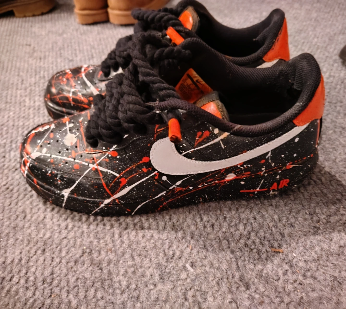 Selling a pair of custom Nike Air Force 1 shoes. They feature a unique splatter paint design in red and white on a black base. The Nike swoosh is visible on the side. Please take a close look at the photos to see the custom details!