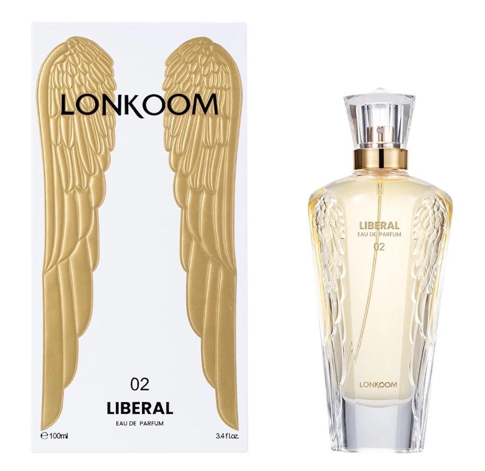 Selling a bottle of LONKOOM Liberal 02 Eau de Parfum. It contains 100ml (3.4 fl.oz) of fragrance. The bottle and packaging feature a unique wing design