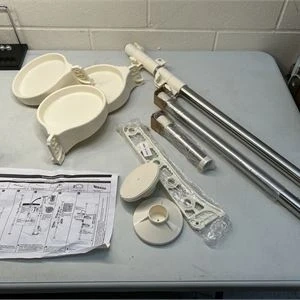 With 1 hook and 3 trays that can be be stored upright or rotated 360 degrees, height adjustable.