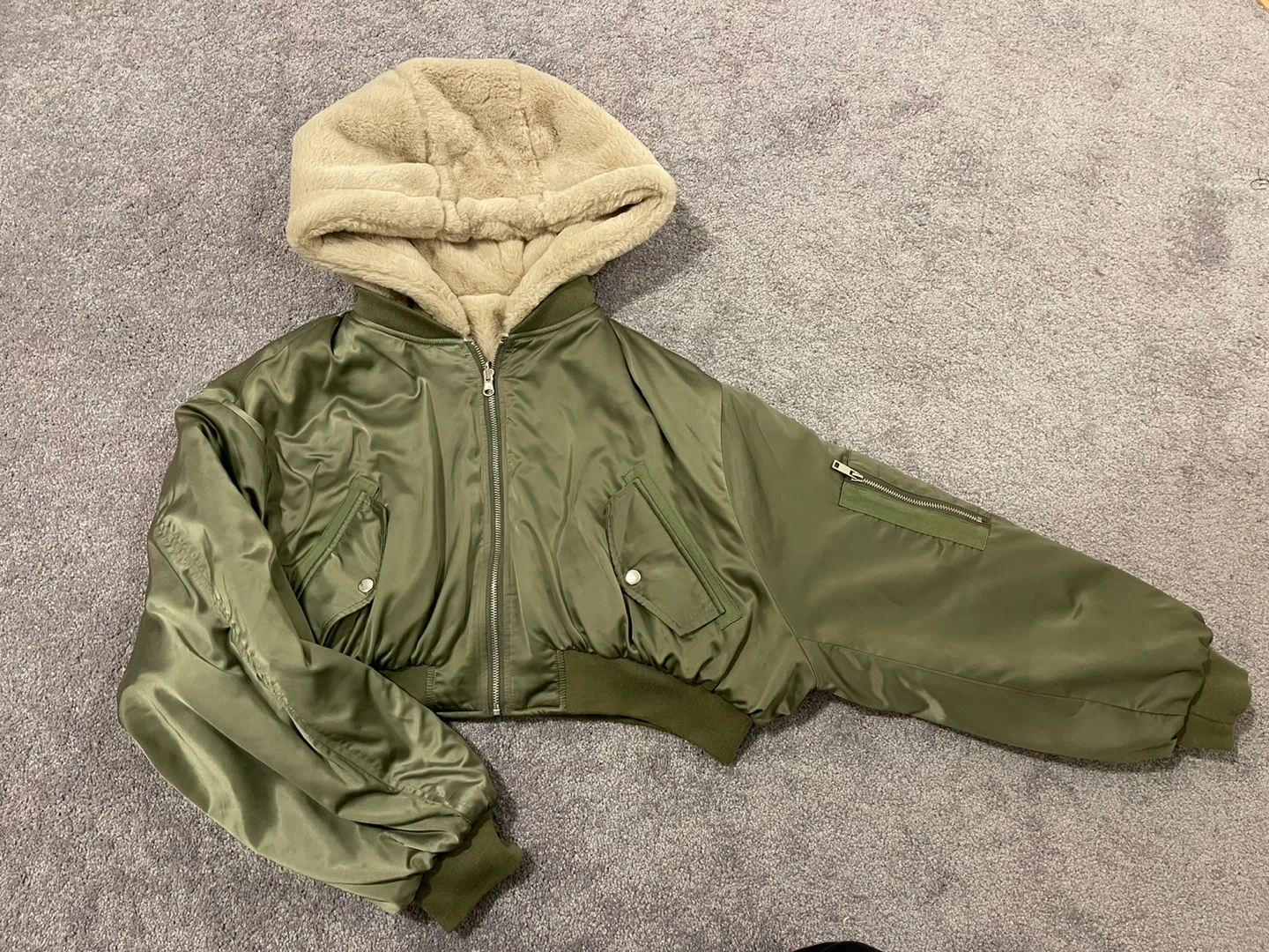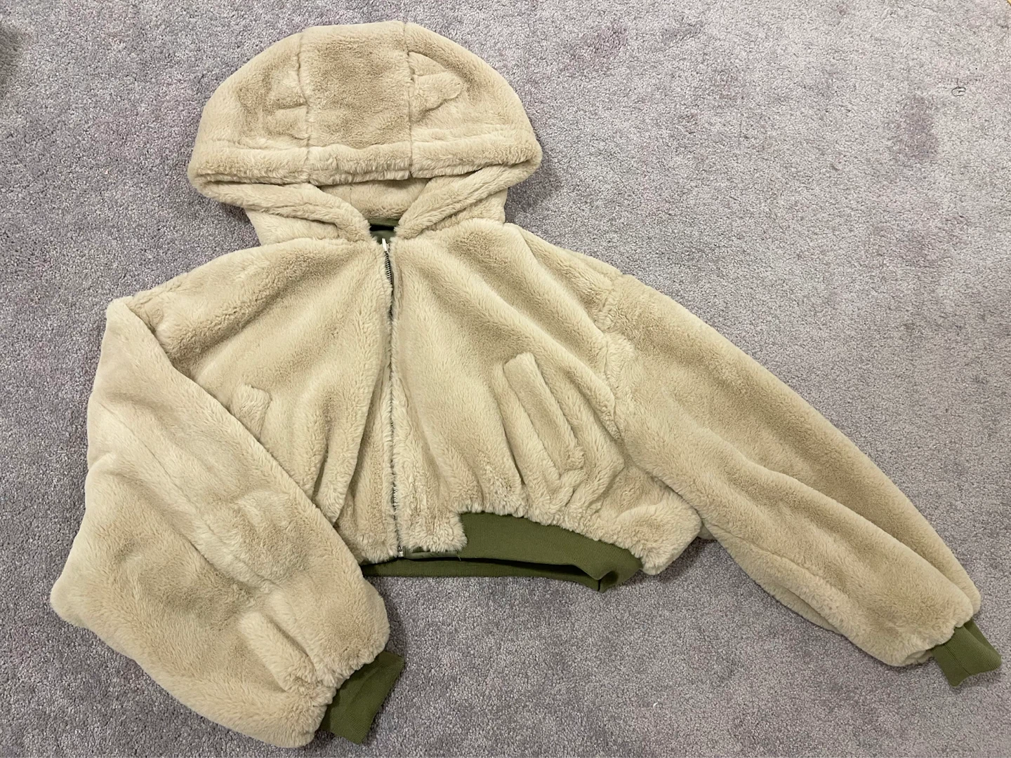 One side is a soft, beige faux fur, perfect for staying warm and stylish. The other side is a smooth, olive green material, giving you a different look. It's in great condition!