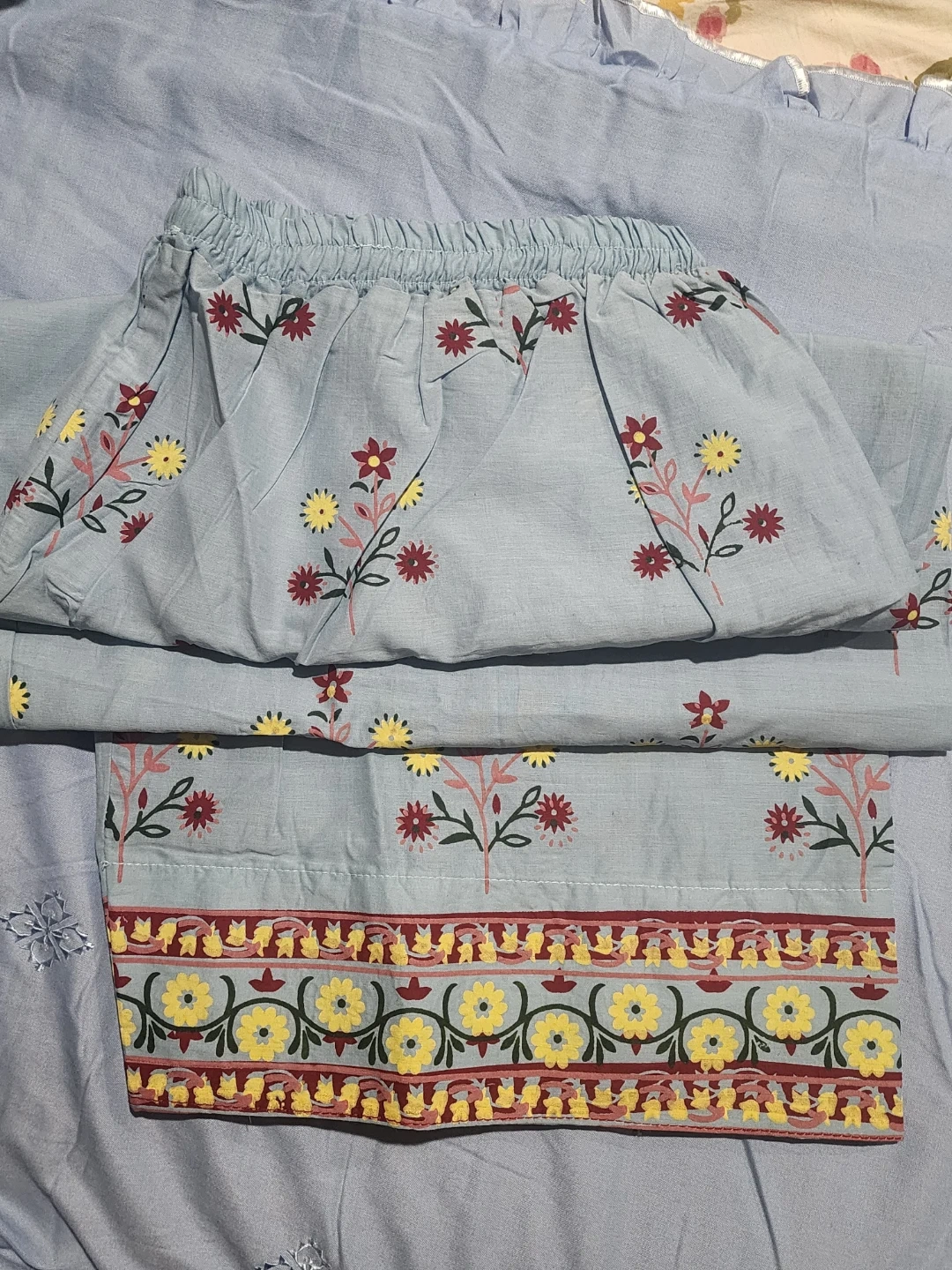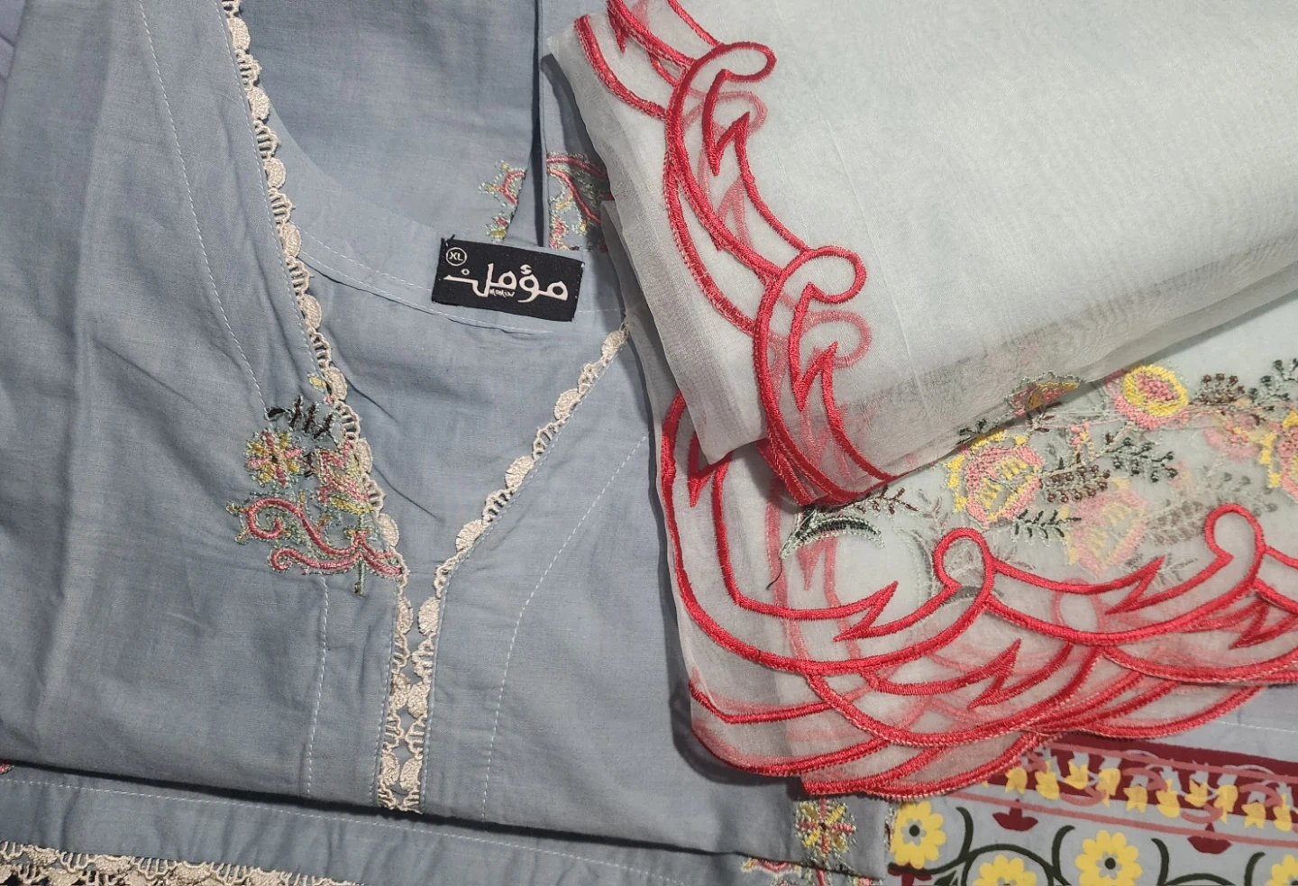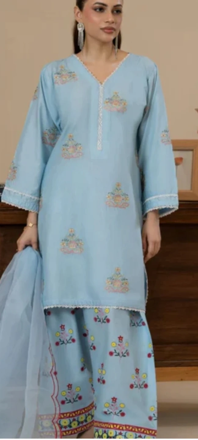 Beautiful light blue shalwar kameez with delicate embroidery. This traditional outfit is perfect for special occasions or everyday wear. It features a comfortable fit and a stylish design. The fabric is soft and breathable, making it ideal for all-day comfort. A lovely addition to any wardrobe!