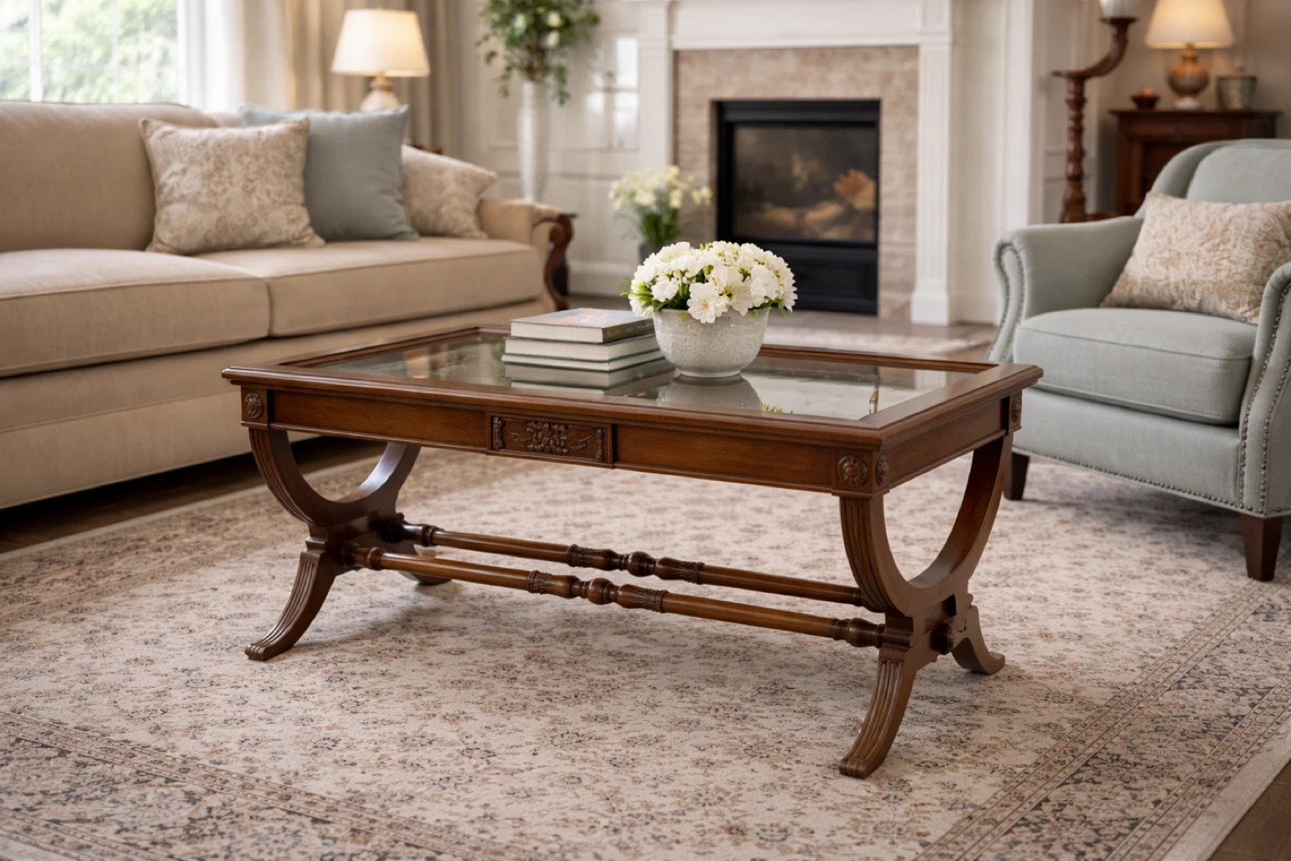 Here's a lovely vintage wood coffee table! It has a glass top and a beautiful wood design. It's in great condition and would look great in any living room
