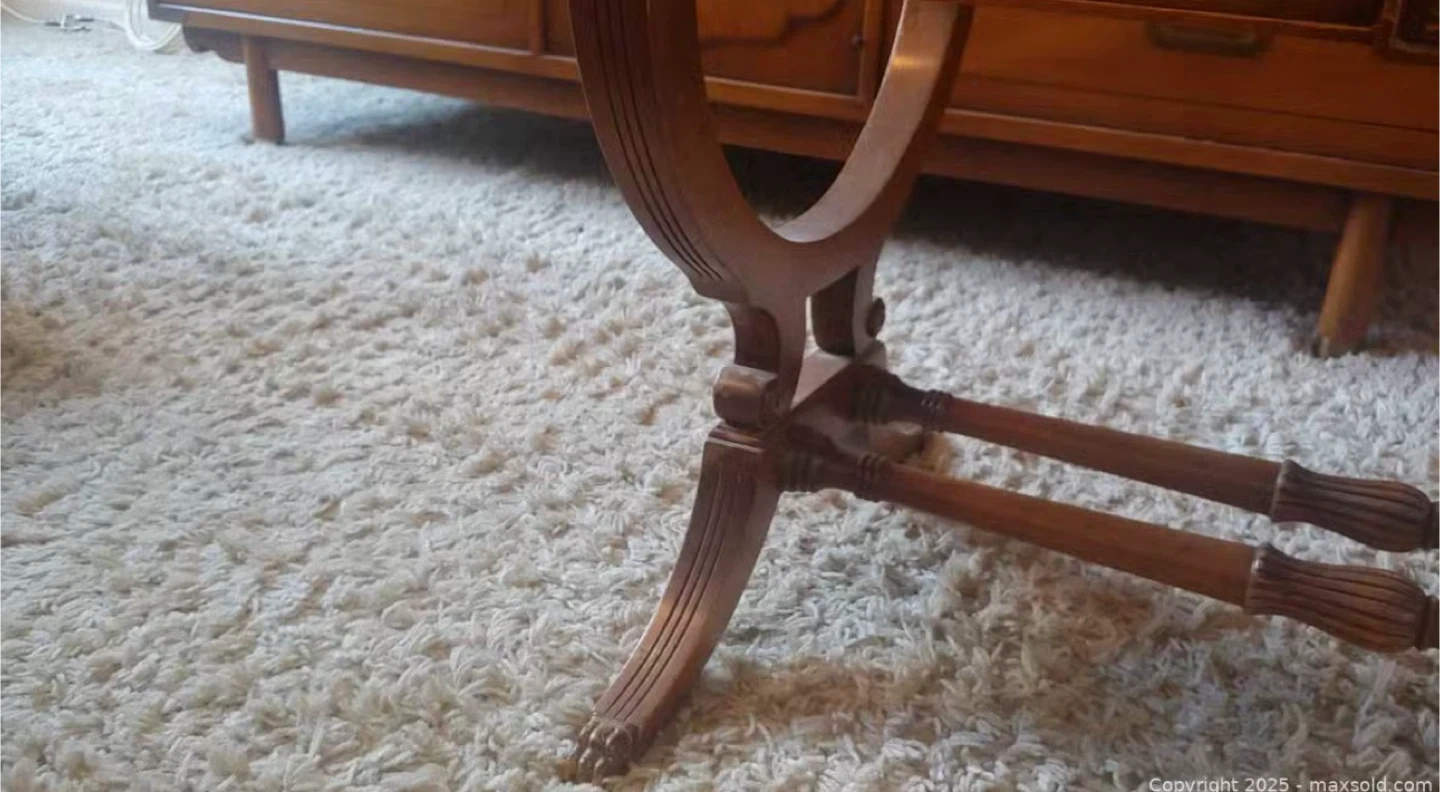Here's a lovely vintage wood coffee table! It has a glass top and a beautiful wood design. It's in great condition and would look great in any living room