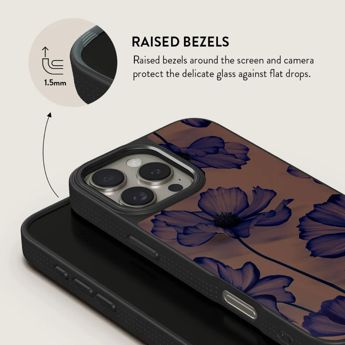 Discover our Velvet Night design. On a soft nude backdrop, blue poppies dance in the untamed rhythm of the wind. A blend of night's peace and daring energy, this iPhone 16 Pro phone case is perfect for those who dream big and seek adventure.