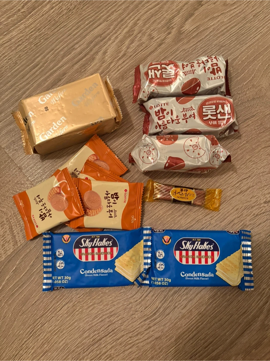 Selling a mix of yummy snacks! Includes Lotte cookies, Garden wafers, and Sky Flakes cracker sandwiches. Perfect for trying new treats or stocking up on your favourites