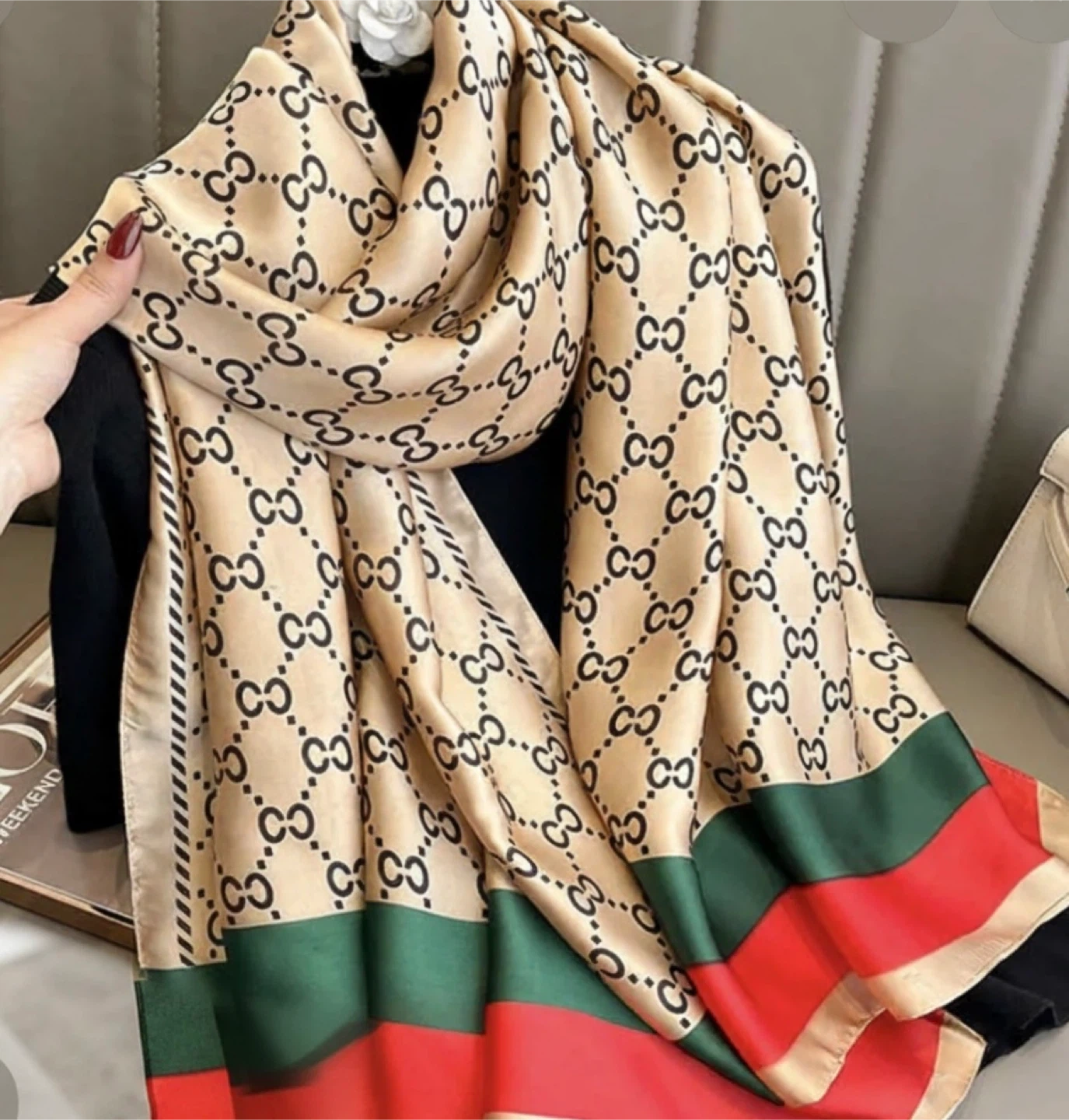 Selling a stylish scarf featuring the iconic GG pattern on a beige background. It also has green and red stripes on the bottom. This scarf is brand new and would make a lovely gift this festive season