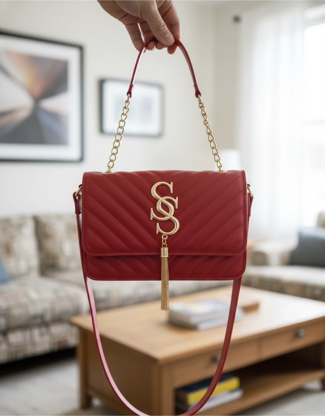 Selling a shoulder bag in red. It has a gold-tone chain and a tassel detail. Great for adding a pop of colour to your outfit!