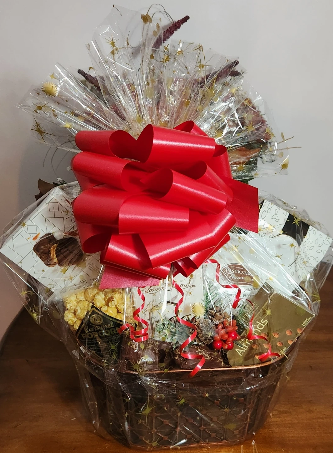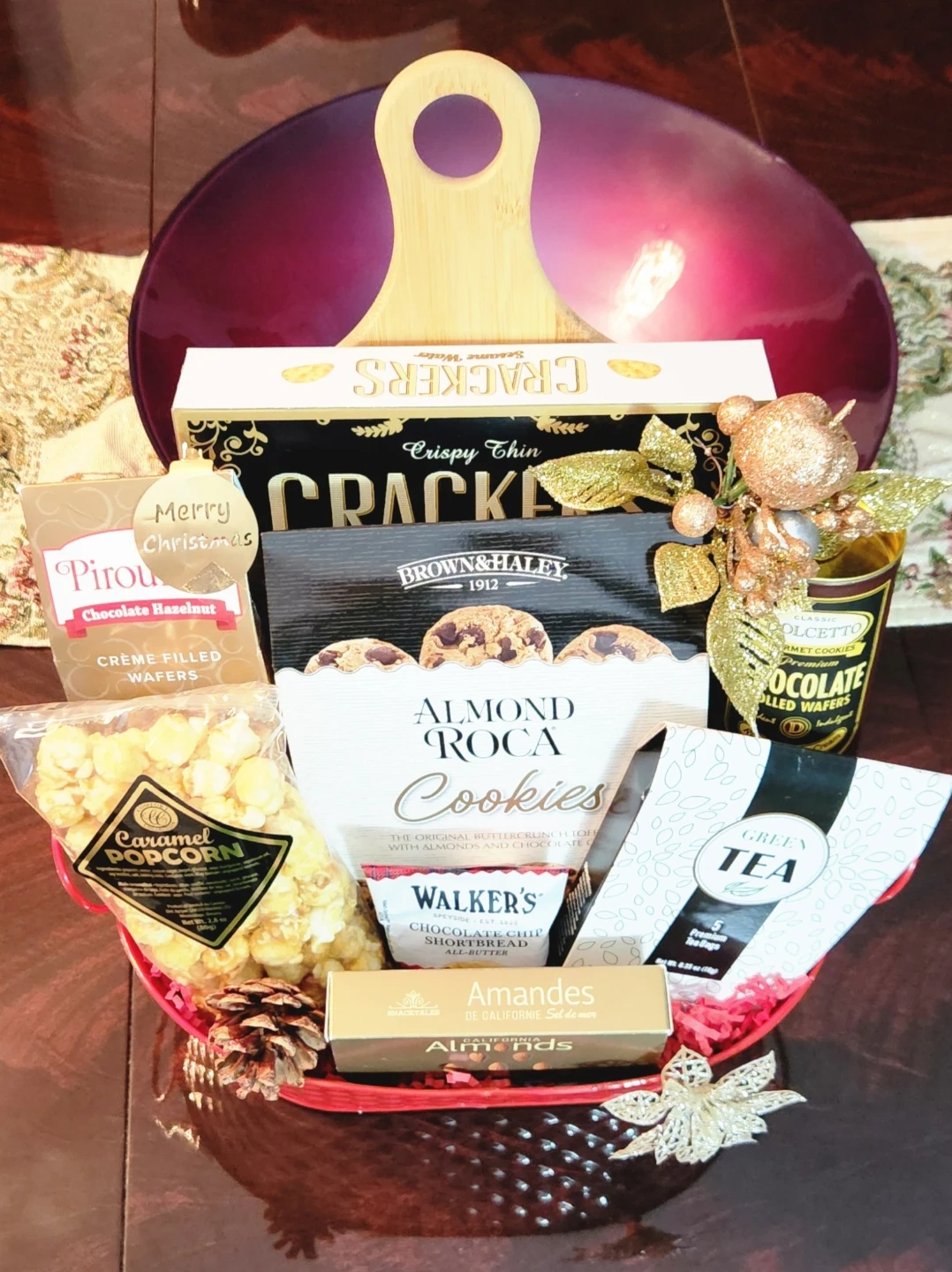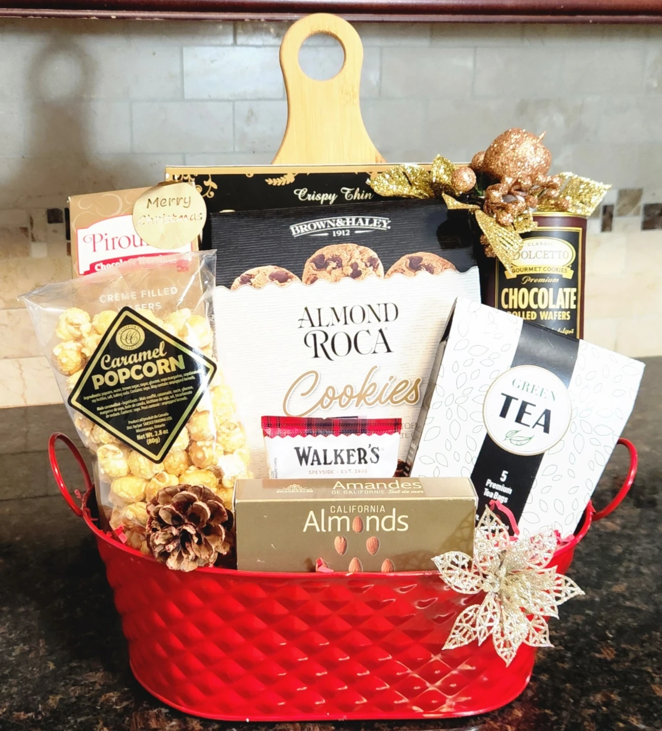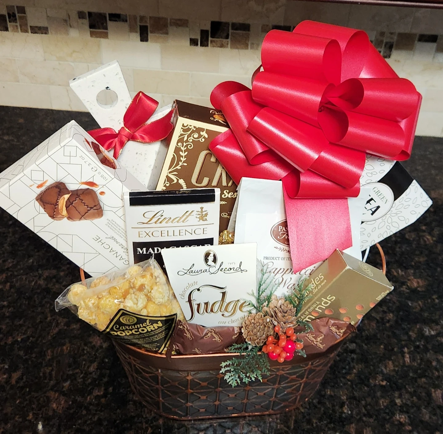 Baskets includes a variety of delicious treats like Lindt Excellence chocolate, Laura Secord fudge, caramel popcorn, Walkers Almond Roca cookies, and more. Perfect for Christmas gift giving, or a treat basket for your family to enjoy.