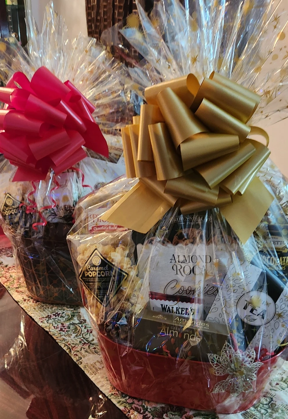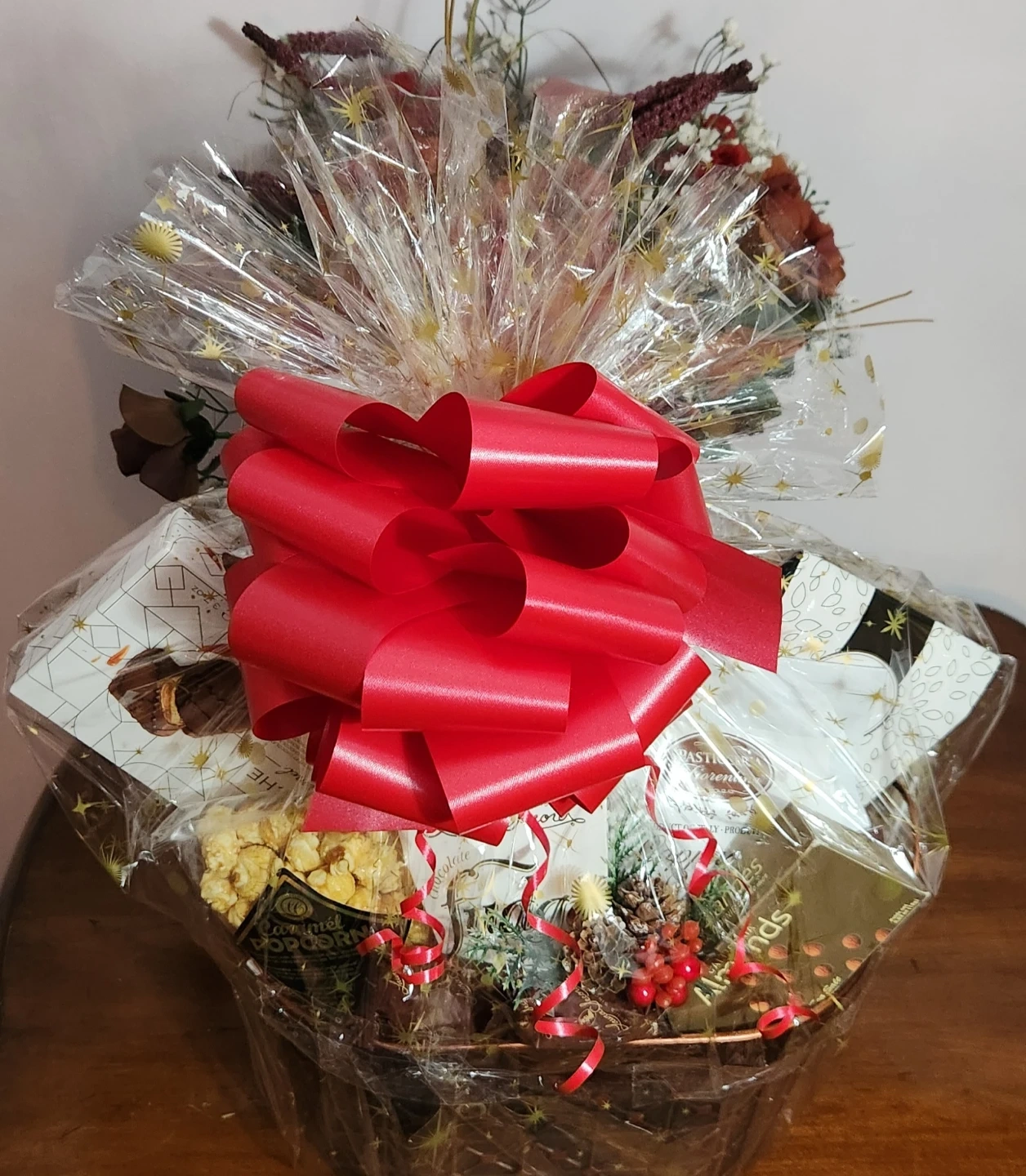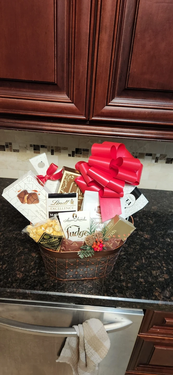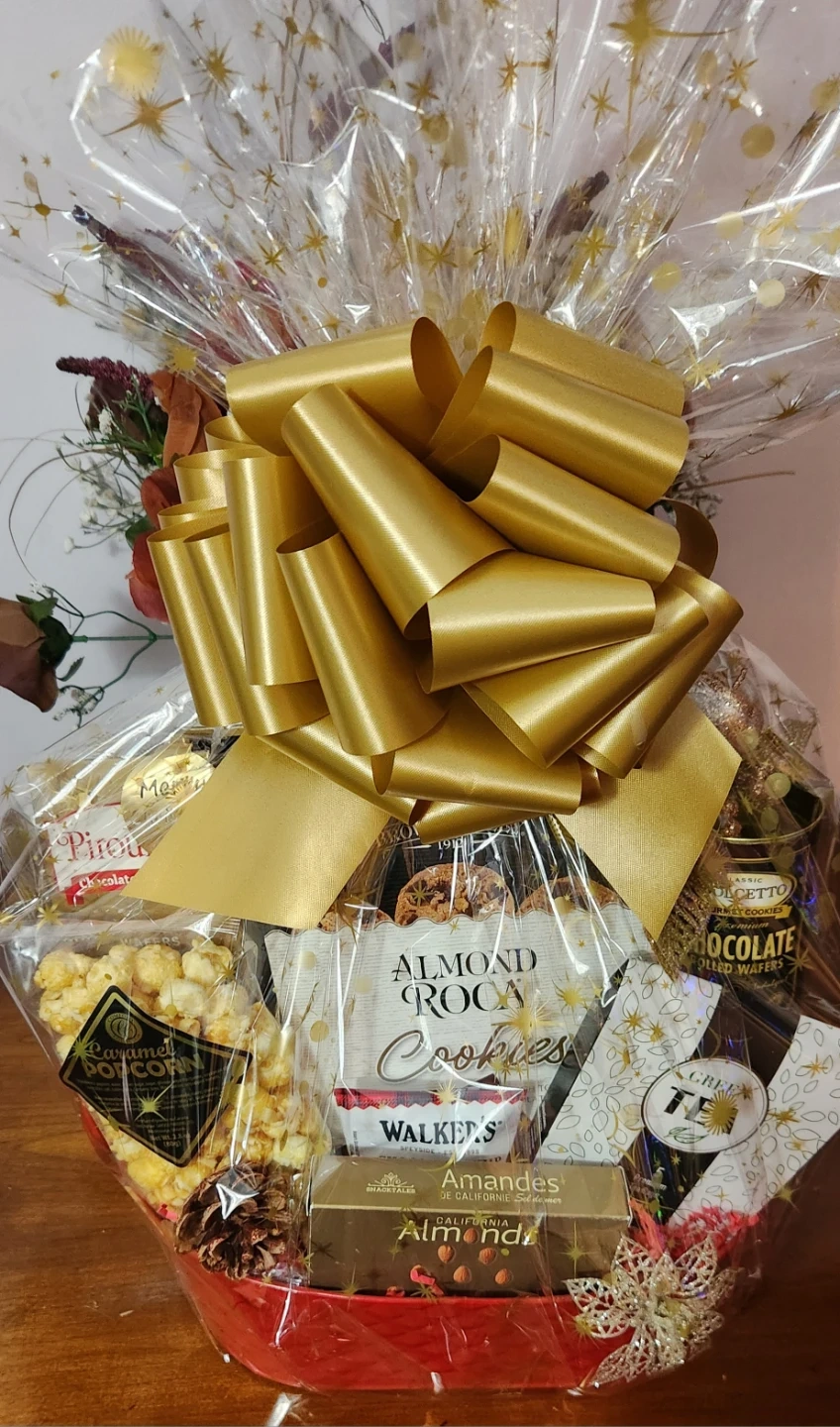 Baskets includes a variety of delicious treats like Lindt Excellence chocolate, Laura Secord fudge, caramel popcorn, Walkers Almond Roca cookies, and more. Perfect for Christmas gift giving, or a treat basket for your family to enjoy.