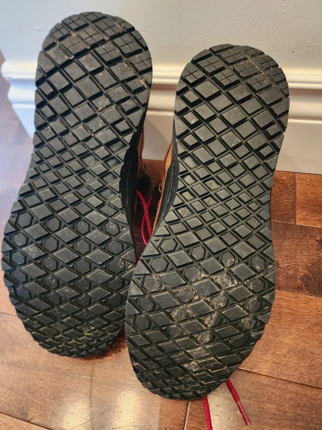 Size is men's US 12. The boots are brown with black accents and red laces. The soles have a good amount of tread left!