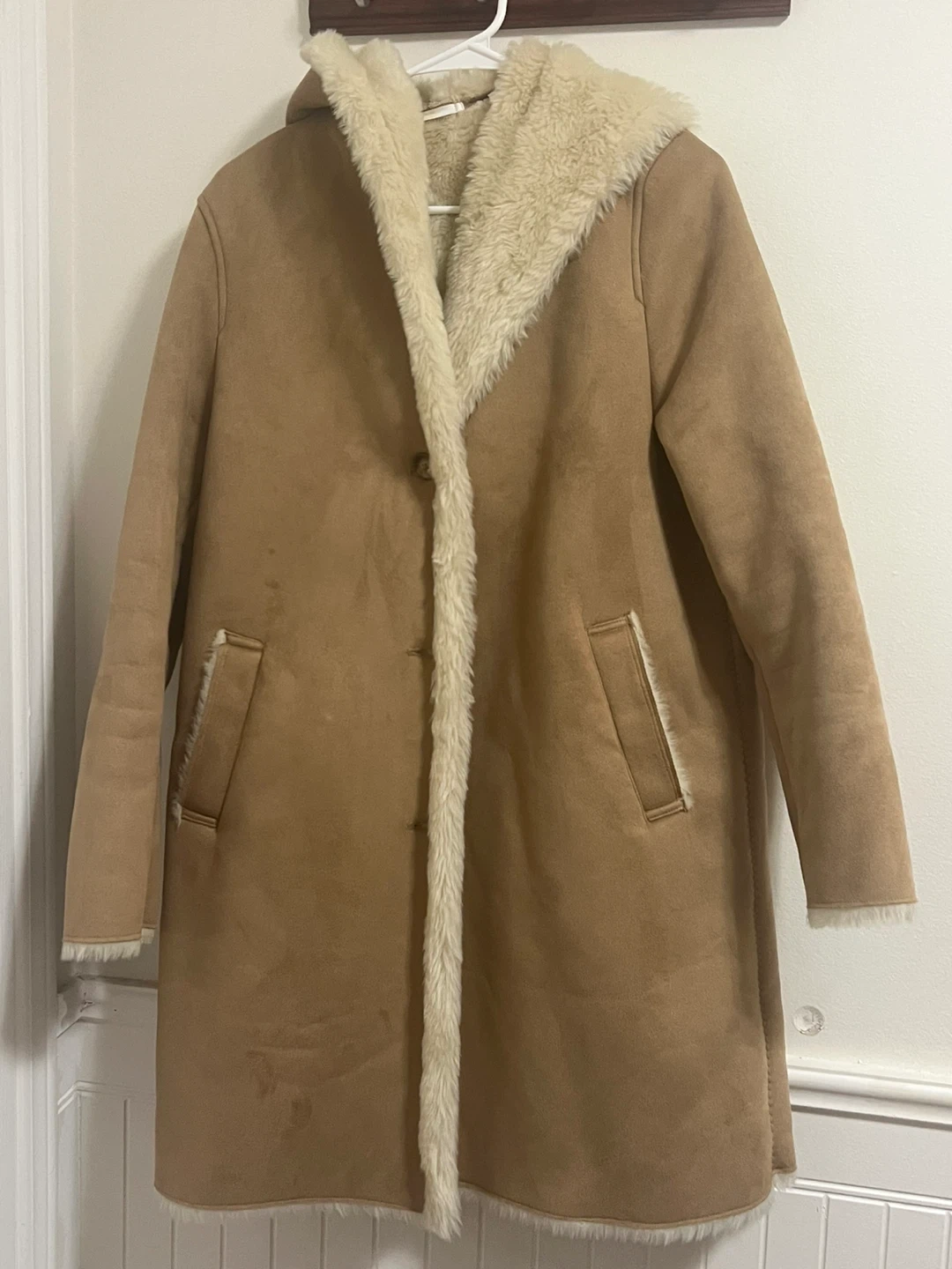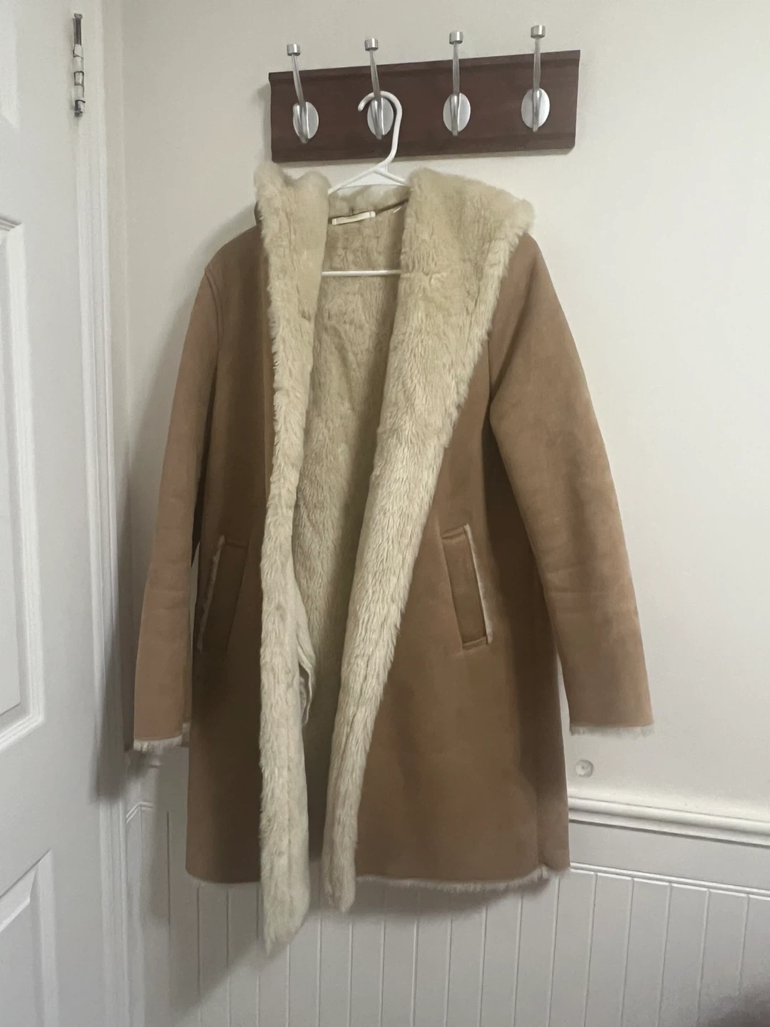 A cozy tan suede coat with shearling lining! Perfect for chilly days, this coat is in great condition and ready to keep you warm. It features a soft shearling trim and lining, adding a touch of luxury to your winter wardrobe