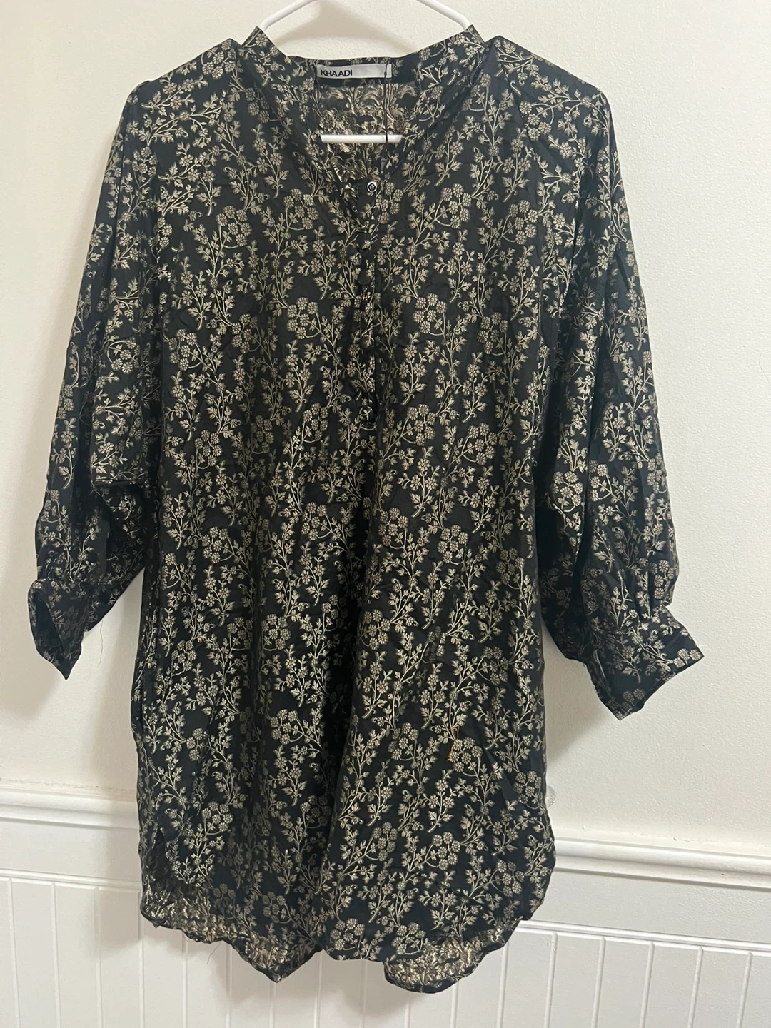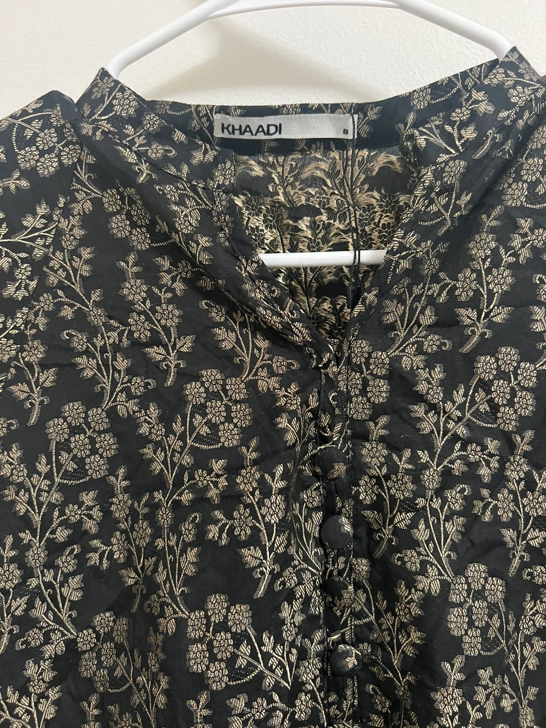 Selling a Khaadi top with a beautiful black and gold floral print. It's a size 8 and in great condition! The material feels lovely and it has a stylish button-up front. Perfect for adding a touch of elegance to your wardrobe