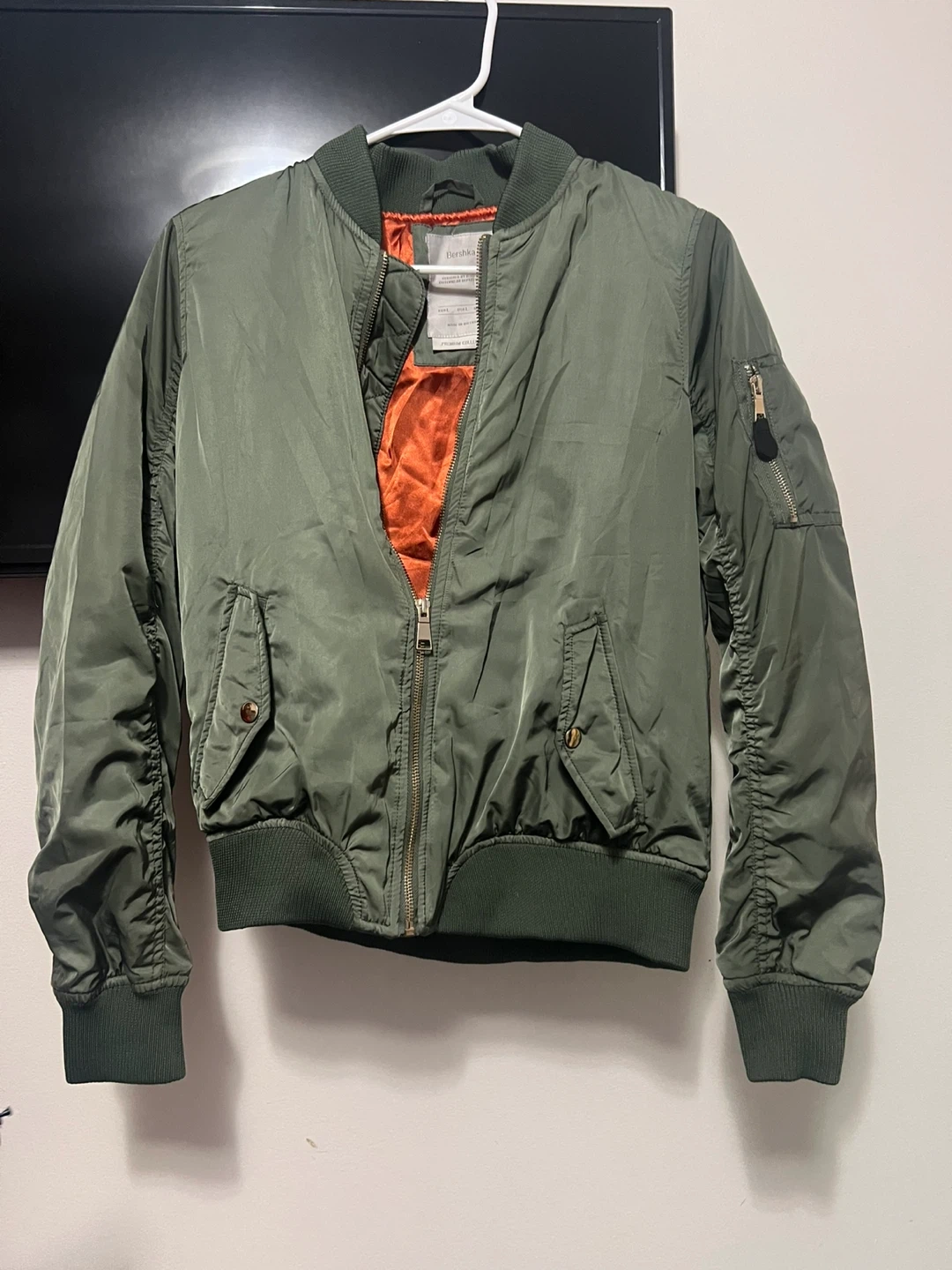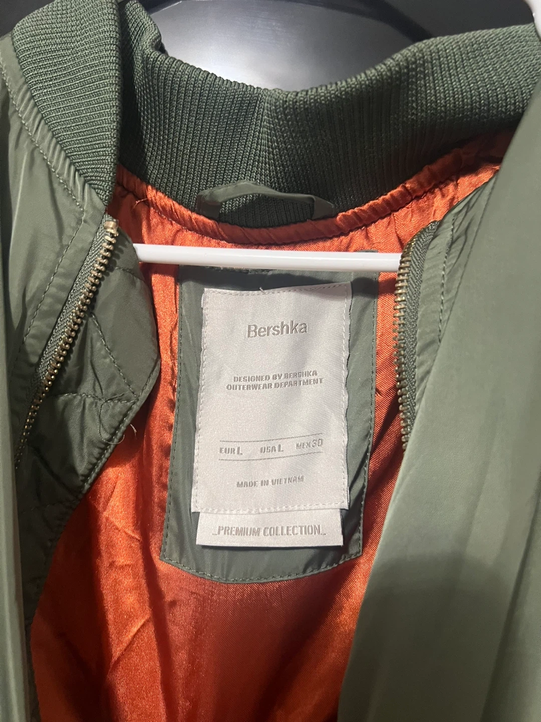 Selling a Bershka bomber jacket in olive green! It's a size L and in great condition. The jacket is from their Premium Collection. It has a cool orange lining and a classic bomber style. Perfect for adding a bit of edge to your wardrobe!