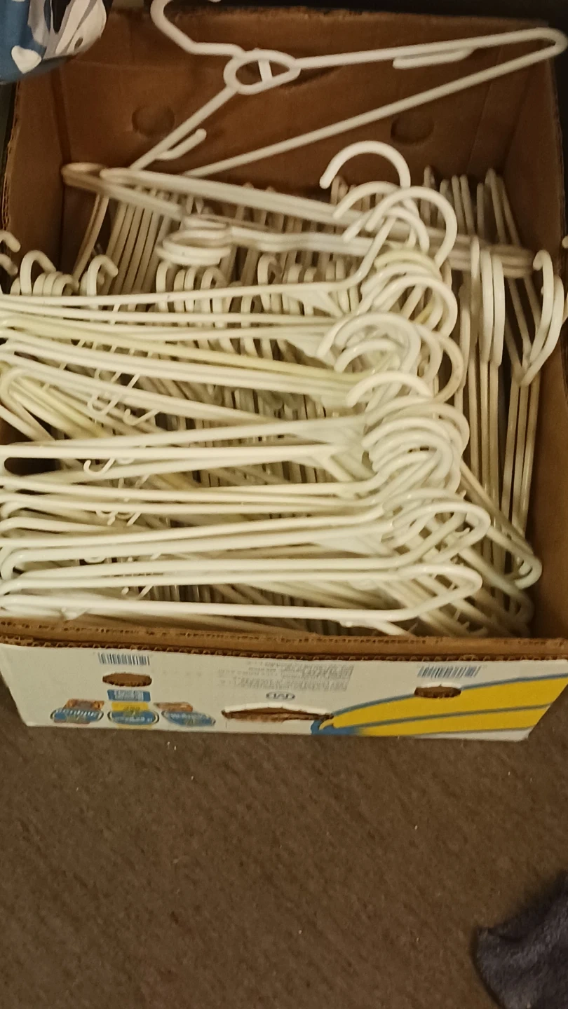 Selling a box full of white plastic clothes hangers! They're in excellent condition... their ready to help organize your closet or wardrobe. A great way to keep your clothes neat and tidy. Usually they sell for around $3.99 for 5 hangers, making it 79 cents per. I'm selling them at 20 cents a piece, there are roughly 100 hangers! Buy as many as you want! If you purchase the whole box, $15.