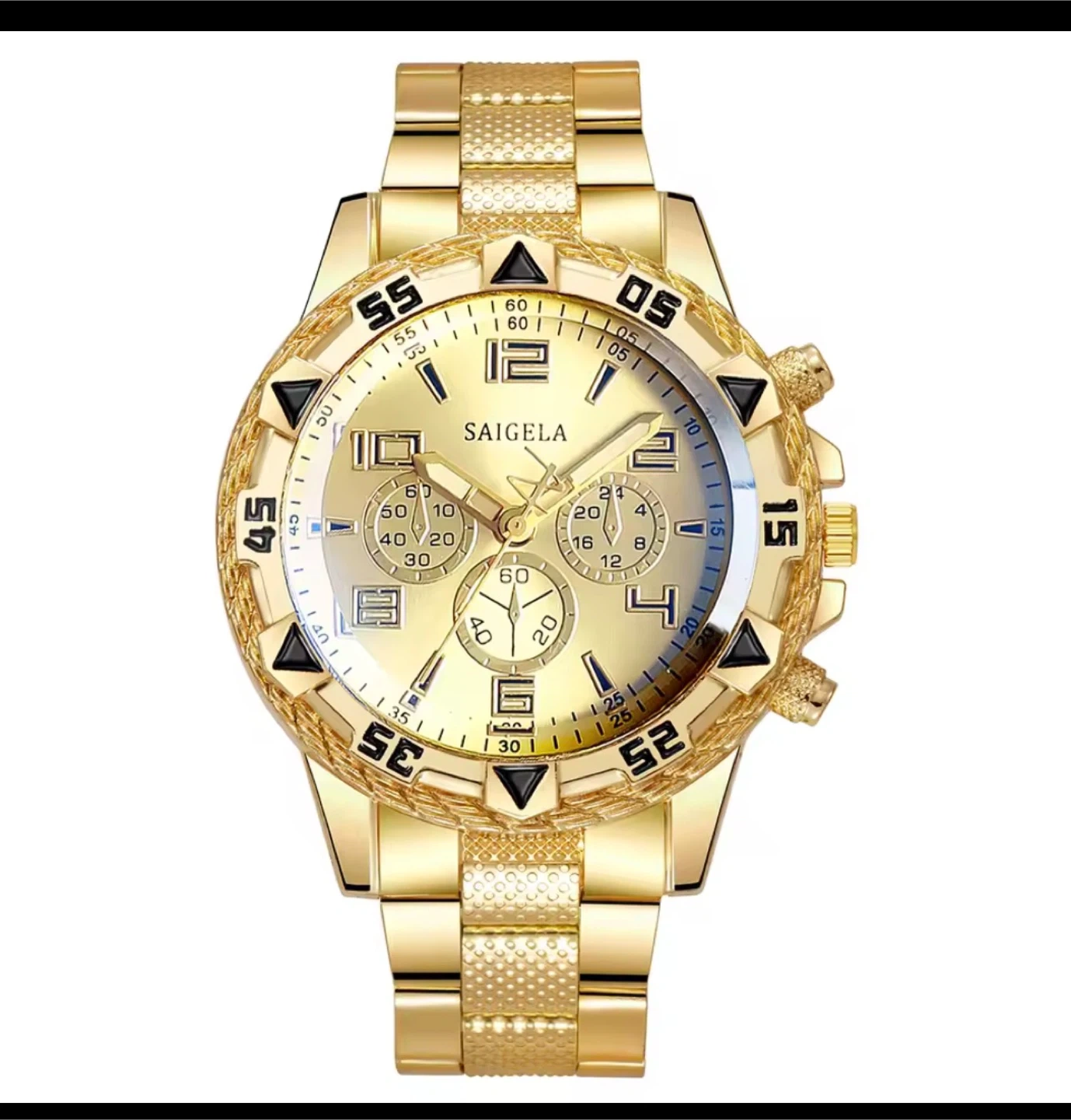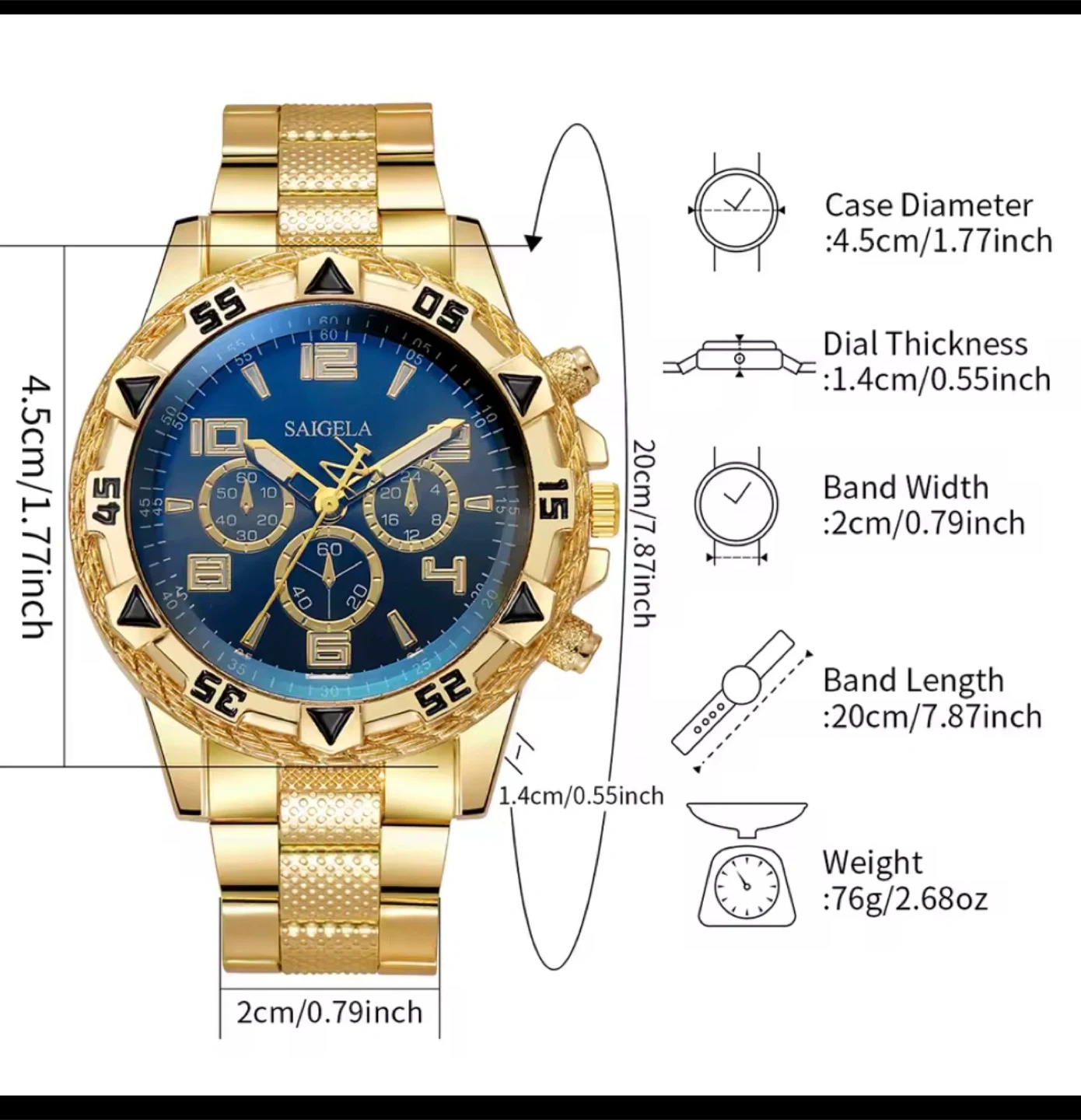 Check out this stylish Saigela men's watch! It has a case diameter of 4.5cm and a dial thickness of 1.4cm. The band width is 2cm and the band length is 20cm. It's a beautiful gold colour and weighs 76g