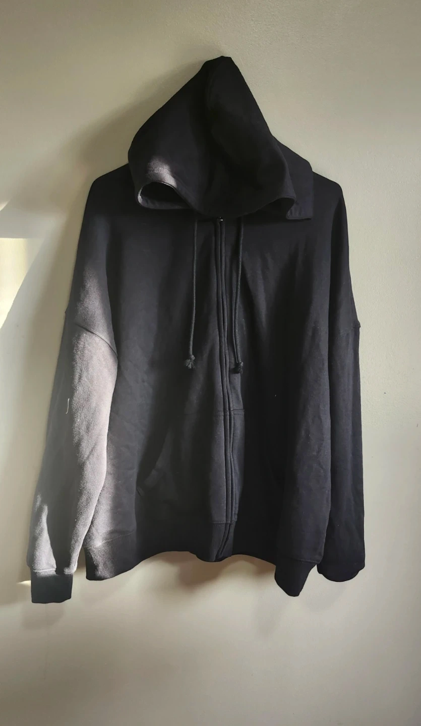 Here's a comfy black zip-up hoodie! It's in great condition and perfect for layering on those cooler days. It features a full zipper and a hood.