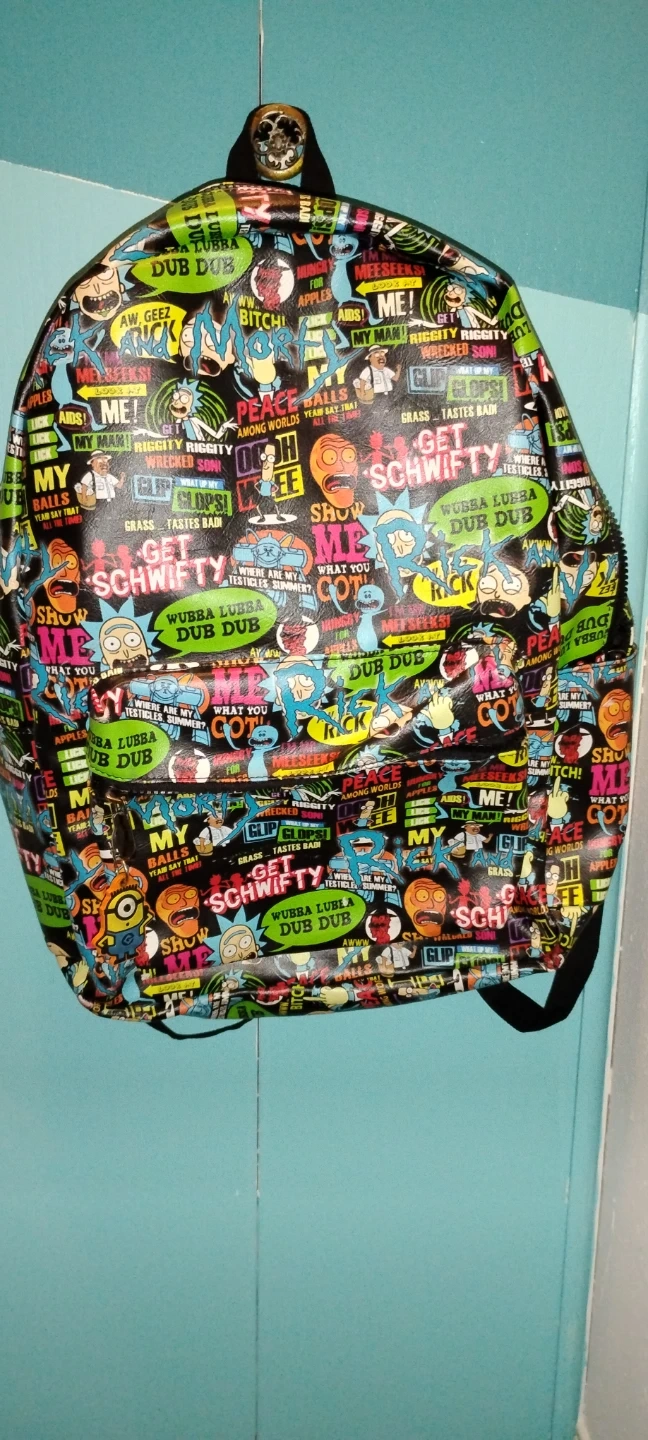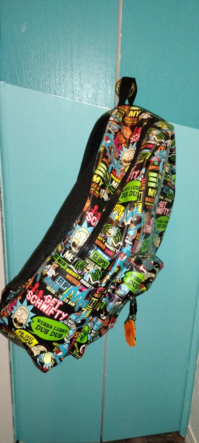 Selling a Rick and Morty themed backpack! It's in great condition and features a colourful all-over print with characters and catchphrases from the show. Perfect for any fan!