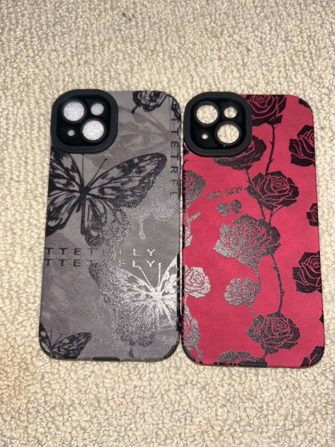 Selling a set of two iPhone cases from Butterfly. One is a grey case with a butterfly design, and the other is a red case with a rose design. They're in great condition! Never used! ALL FUNDS GO TO CHILDREN’S SUPPORT CHARITY!!!