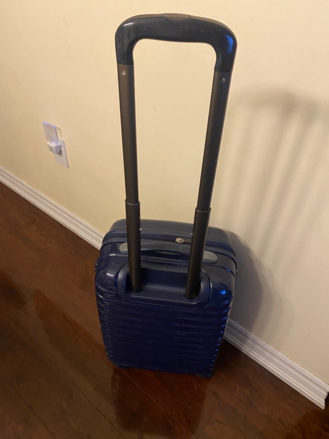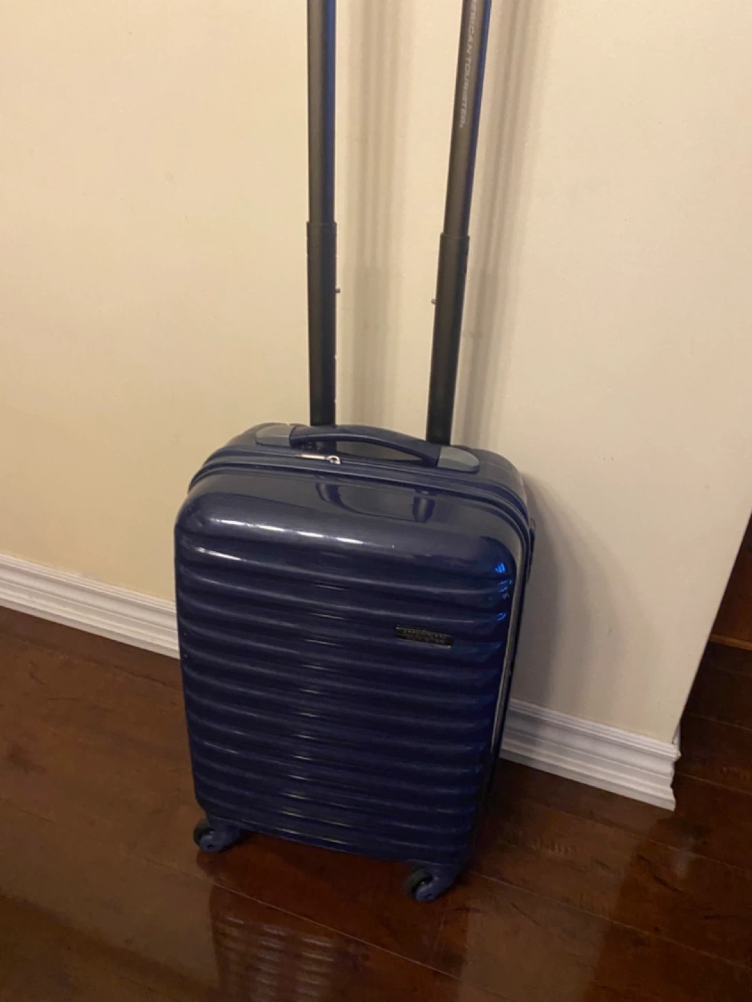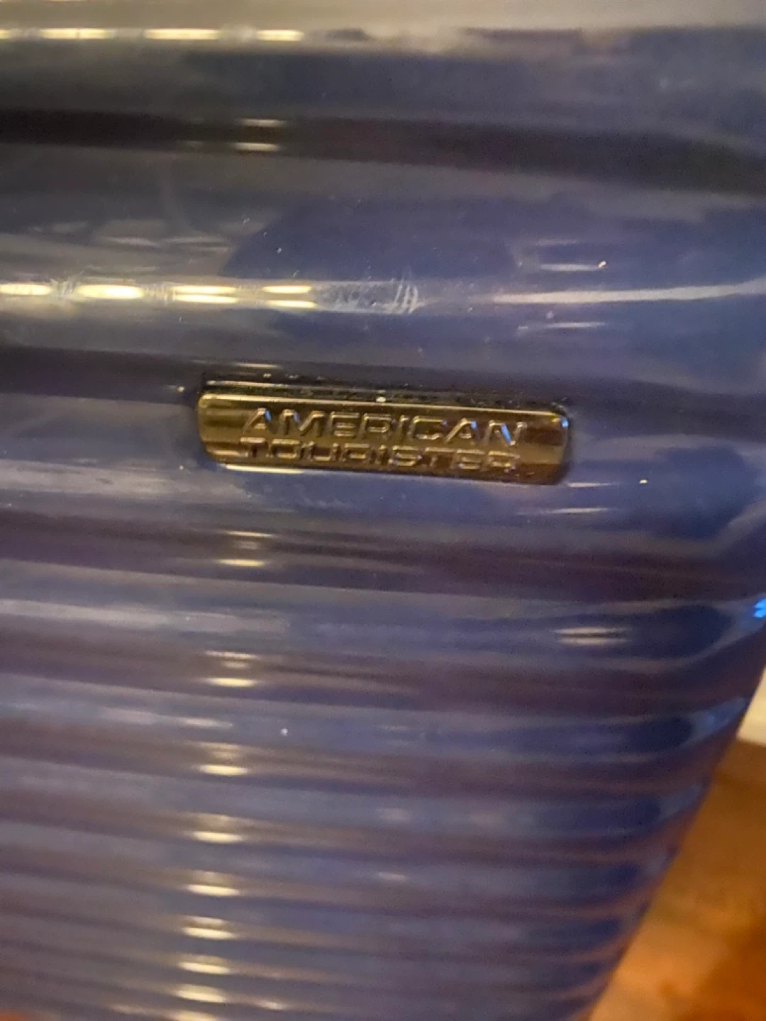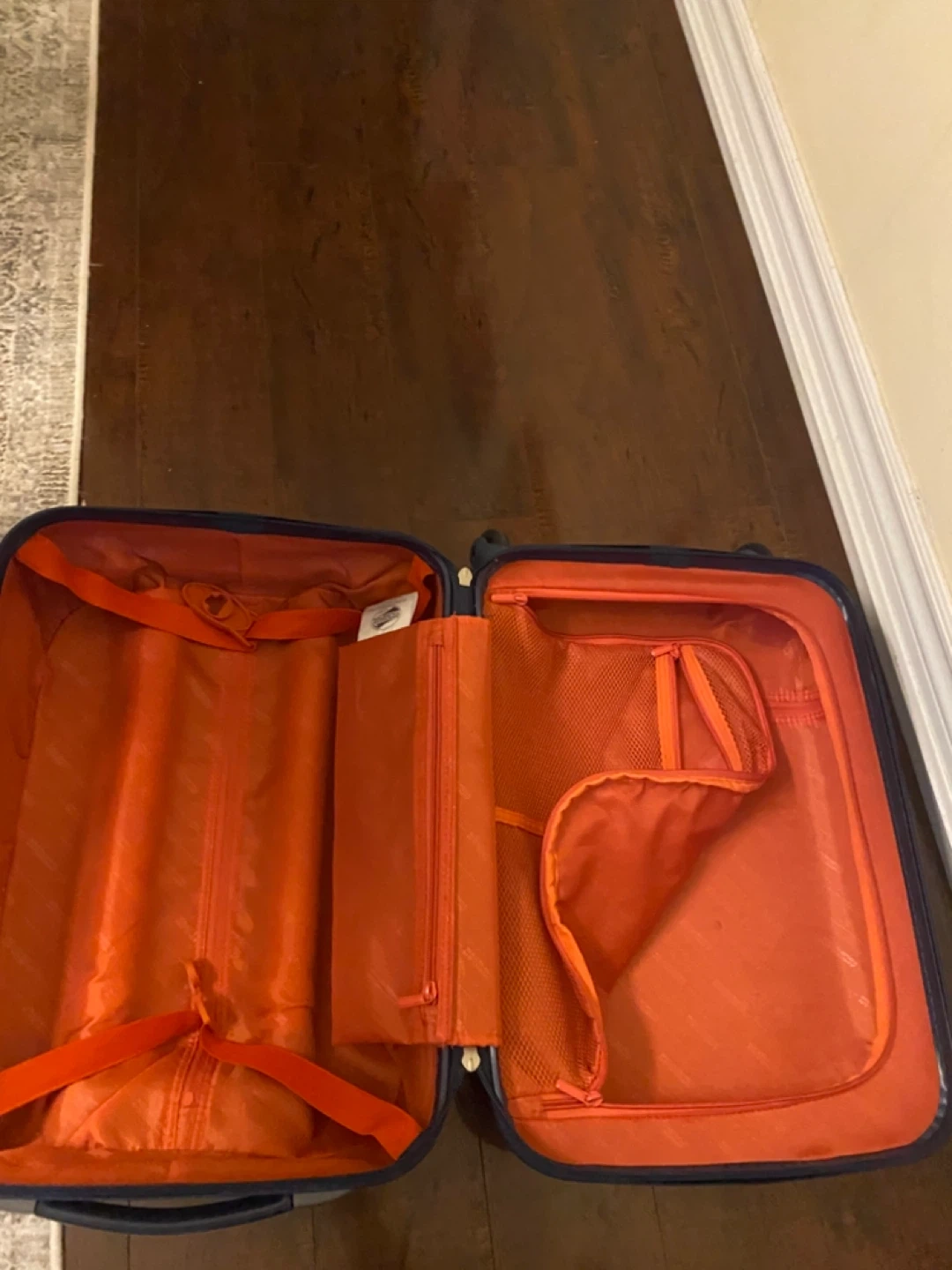 Selling an American Tourister carry-on suitcase in blue. It's in good condition and ready for your next trip! The interior is orange and has several compartments to help keep your belongings organized.
