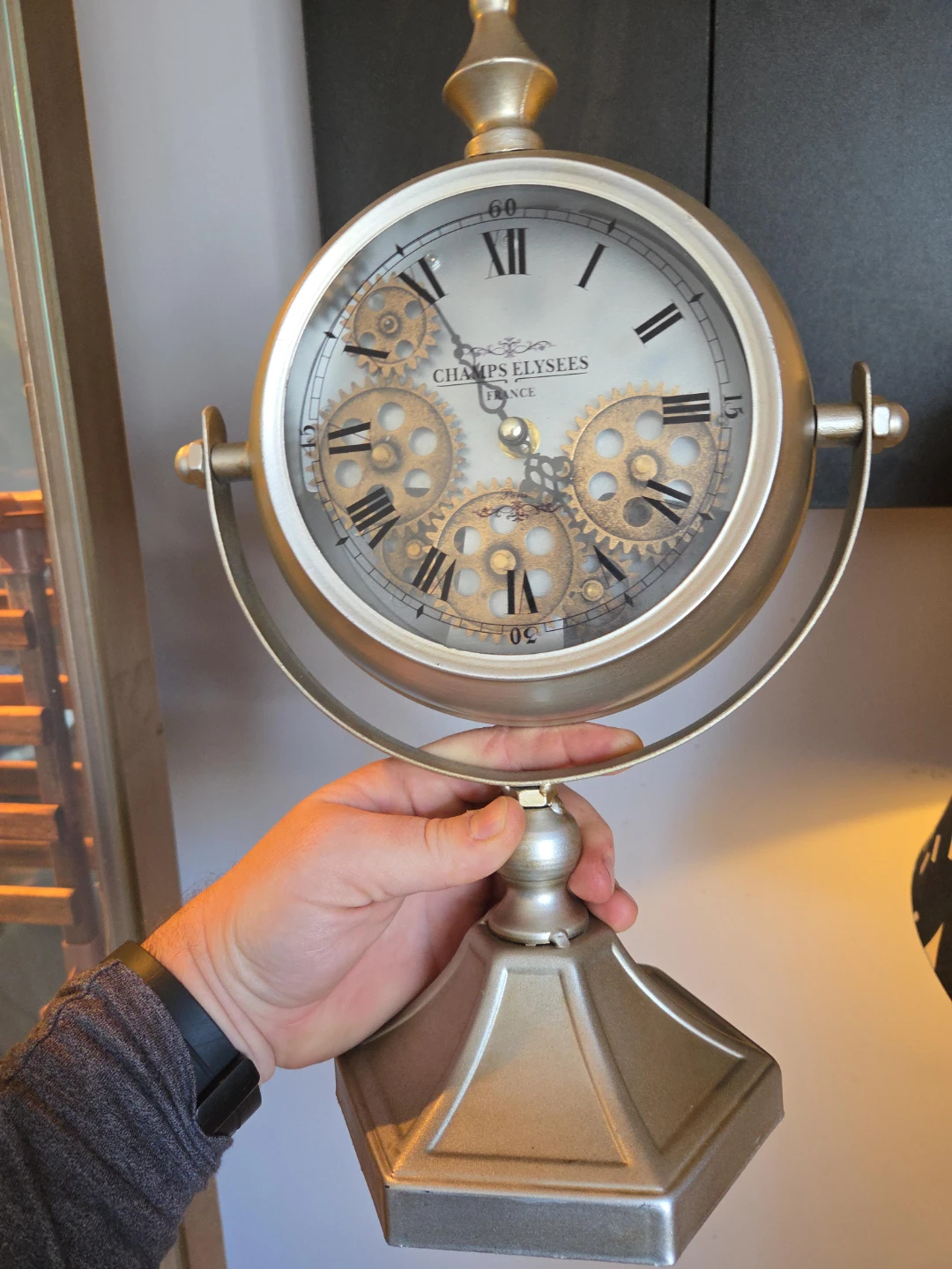 Selling a unique Champs Elysees France table clock from Bowring! It features a visible gear design and a classic Roman numeral display. Perfect as a decorative piece for any room