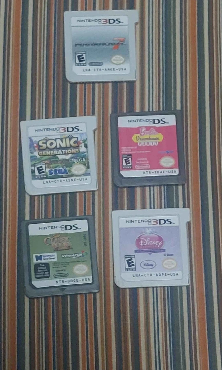 Black Nintendo 3DS XL for sale, in excellent condition. Comes with a carrying case, charger, stylus, and games: Barbie Dreamhouse, Junior Classic Books, Sonic Generations, and Mario Kart 7. Well cared for and ready to play!