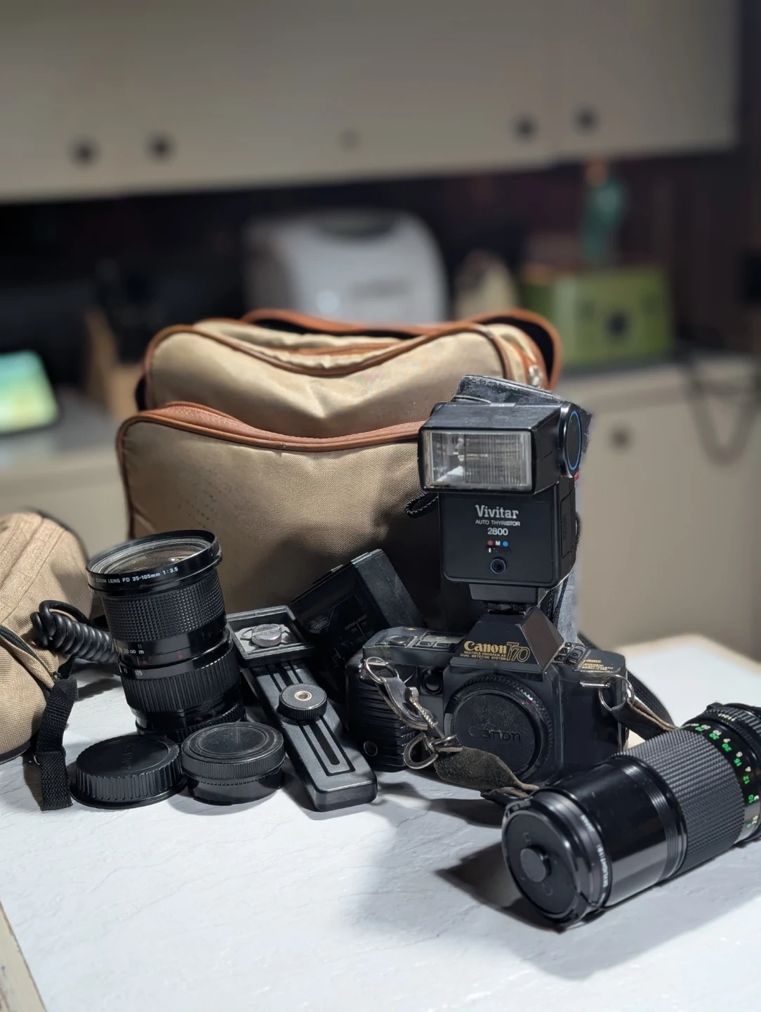 Selling a Canon T70 vintage camera. It comes with a Vivitar Auto Thyristor 2800 flash and several lenses. Great for photography enthusiasts!