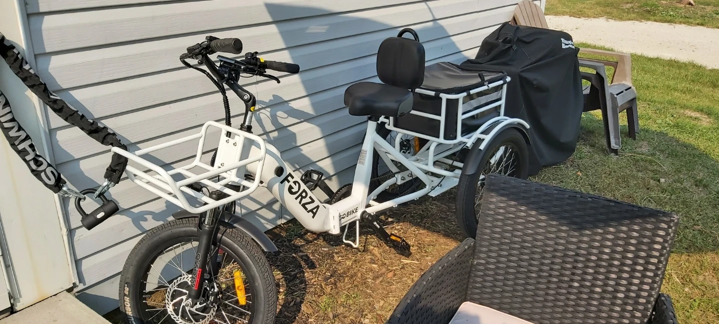 This white GO BIKE Forza Mini electric tricycle offers a unique ride with its three-wheel design. It's equipped with a front basket for storage and a comfortable seat. The trike features fat tires for stability. Great for getting around town or for hauling small items! 2 years old, rode it once. Complete with 2 bike helmets new, tire pump, alarm, and heavy duty lock.