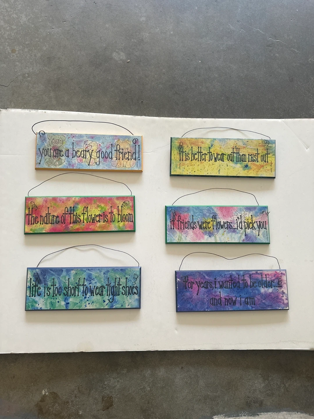 Spruce up your space with these adorable hand-painted wooden signs! Each one has a unique saying and colourful design, perfect for adding a touch of charm to any room in your home $8 each