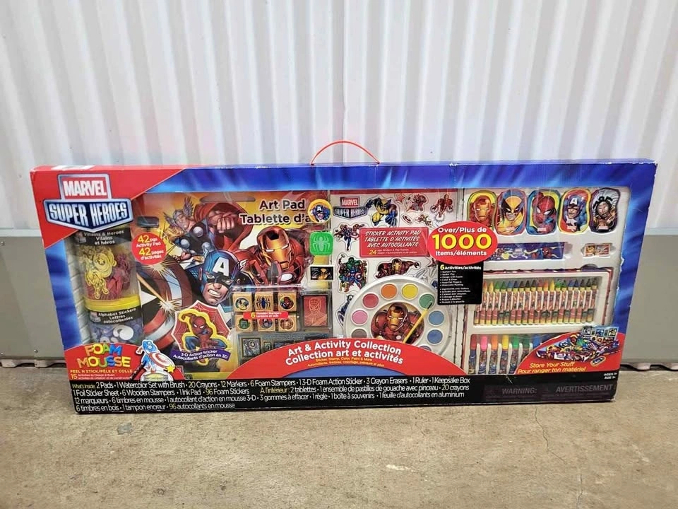 New in box. Includes 2 pads, 1 watercolor set with brush, 20 crayons, 12 markers, 6 foam stampers, 13 D-foam action stickers, 3 crayon erasers, 1 ruler, 1 keepsake box. Features Avengers heroes.