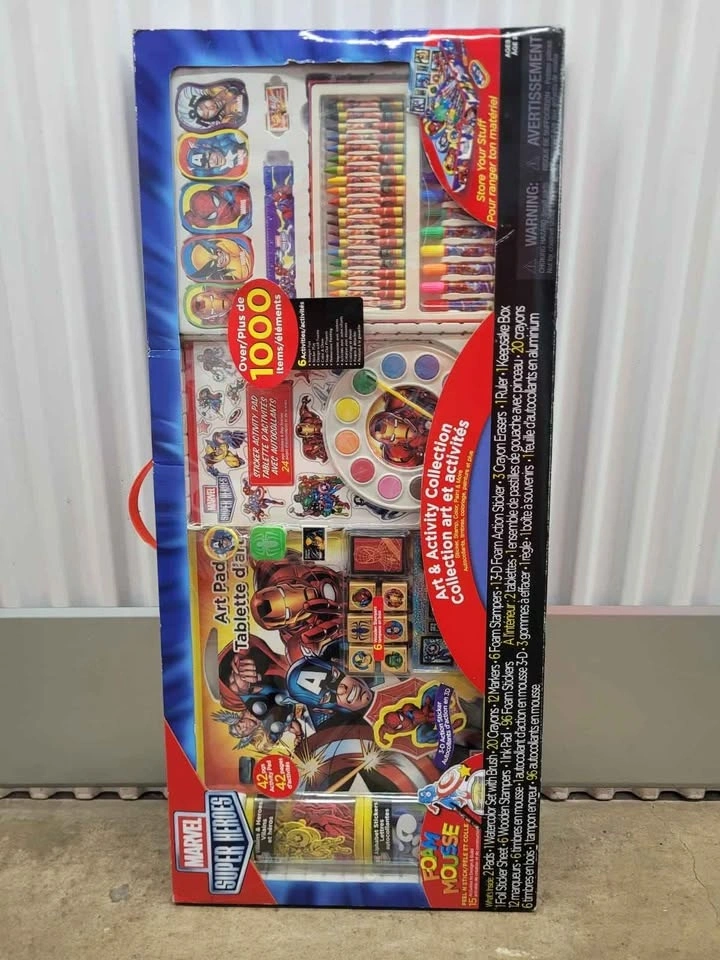 New in box. Includes 2 pads, 1 watercolor set with brush, 20 crayons, 12 markers, 6 foam stampers, 13 D-foam action stickers, 3 crayon erasers, 1 ruler, 1 keepsake box. Features Avengers heroes.