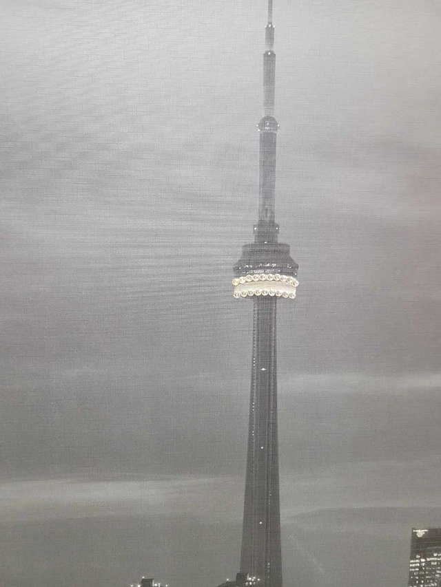 Toronto Skyline, IKEA MYRARP picture frame, with beautiful small white stones embossed to appear like light is emitted from iconic buildings, including the CN Tower. Dimensions: 55½" length x 40" height x 1" thickness.