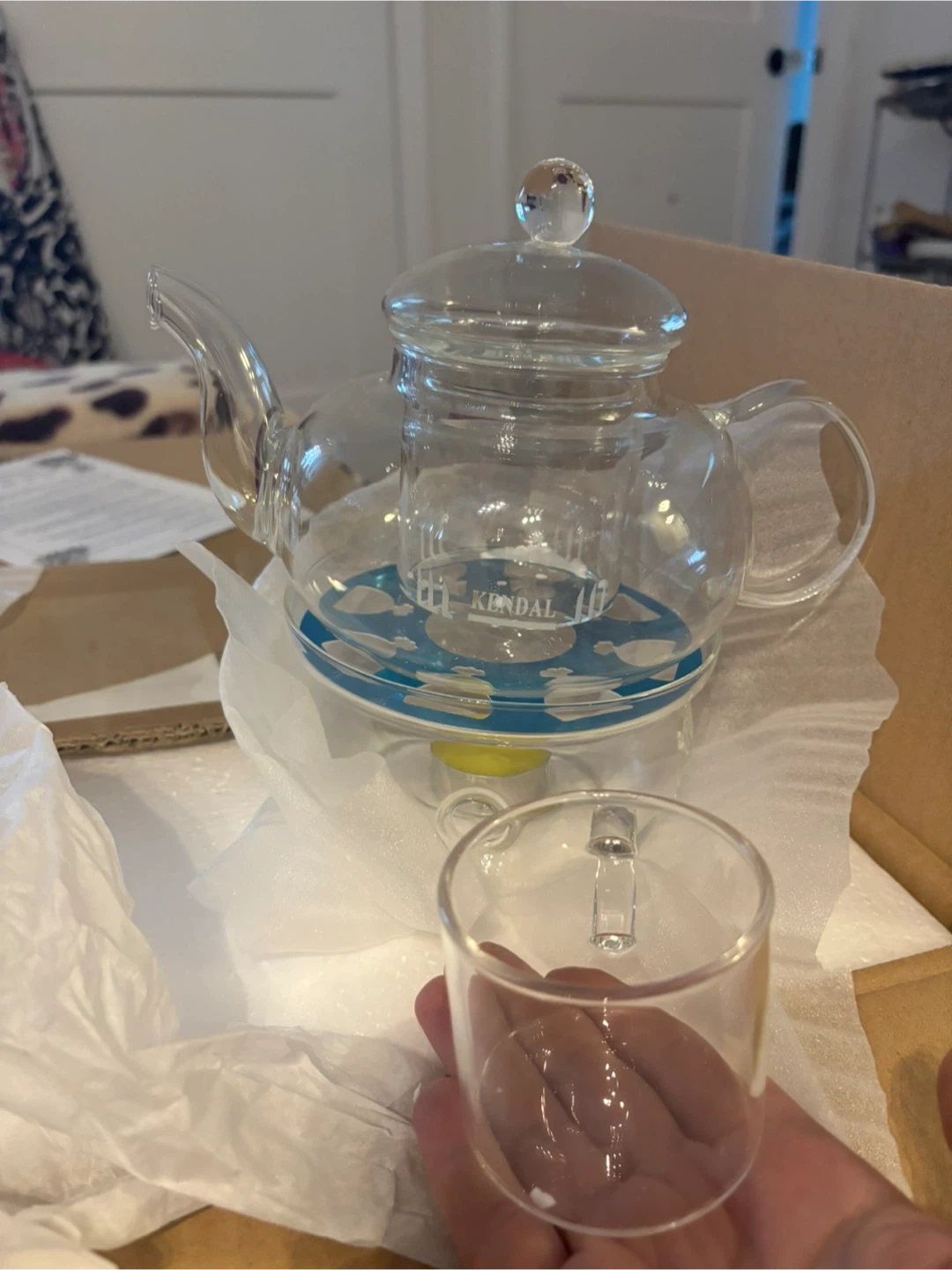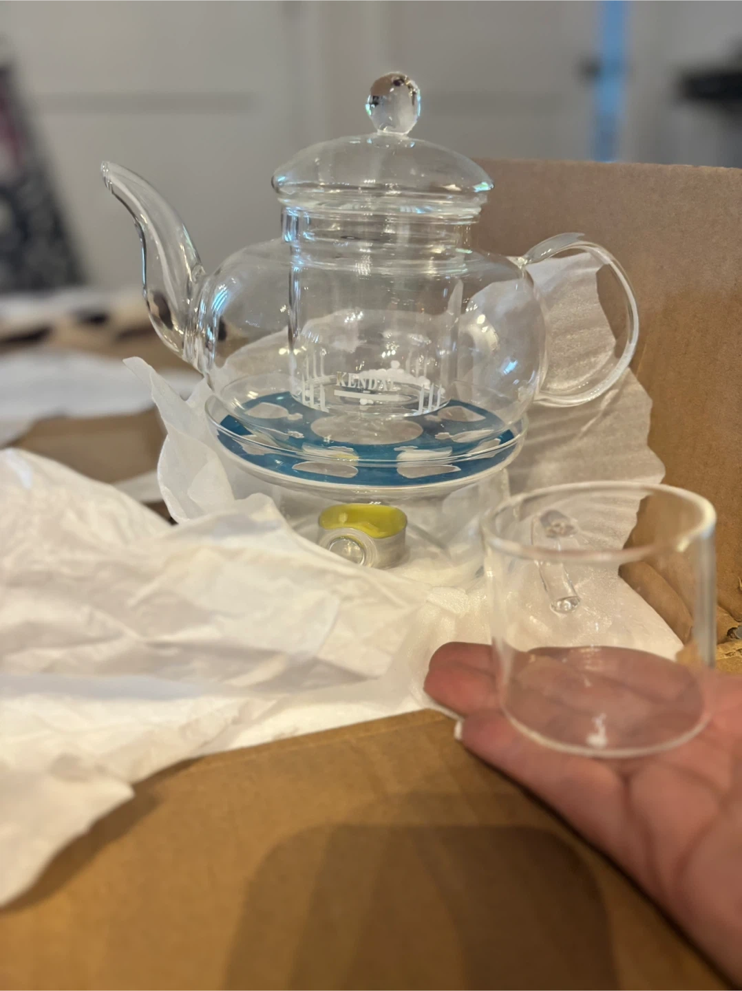 Selling a brand new Kendal glass teapot warmer set, still in its original packaging! This set includes the glass teapot, warmer, and a small candle to keep your tea nice and warm. Perfect for tea lovers!
